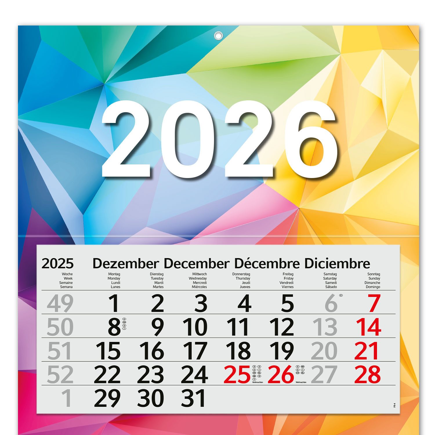 Ausstattungsmerkmale: Viersprachiges Kalendarium (Deutsch, Englisch, Französisch, Spanisch), Sonn- und Feiertage rot markiert, große Schrift, Kalenderwochen, Blockhalter-Stanzung, Aufhängeöse aus Metall, roter Datumsschieber. EXTRA: Jahreskalendarium und internationale Feiertage unter den Kalenderblöcken.