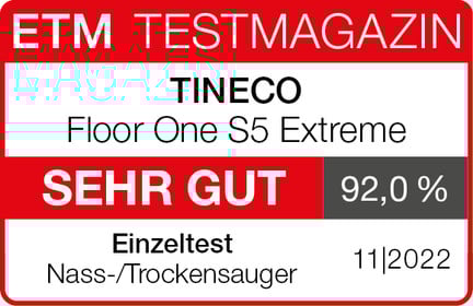 Der Tineco Floor One S5 Extreme erzielt im Vergleichstest des Magazins „Stiftung Warentest“ mit vier weiteren Akkuwischern das Gesamtergebnis „BEFRIEDIGEND (2,8)“. Das Gerät wischt sehr solide: Z. B. entfernt es Feuchtschmutz zuverlässig und vermeidet Schlieren und Wasserfilme „sehr gut“. Es ist einfach zu bedienen. Zwar könnte der Stromverbrauch laut Testbericht etwas geringer sein. Aber die Haltbarkeit ist „sehr gut“. Außerdem punktet die sehr hohe Sicherheit. Insgesamt erreicht das Modell das drittbeste Ergebnis des Testspektrums.