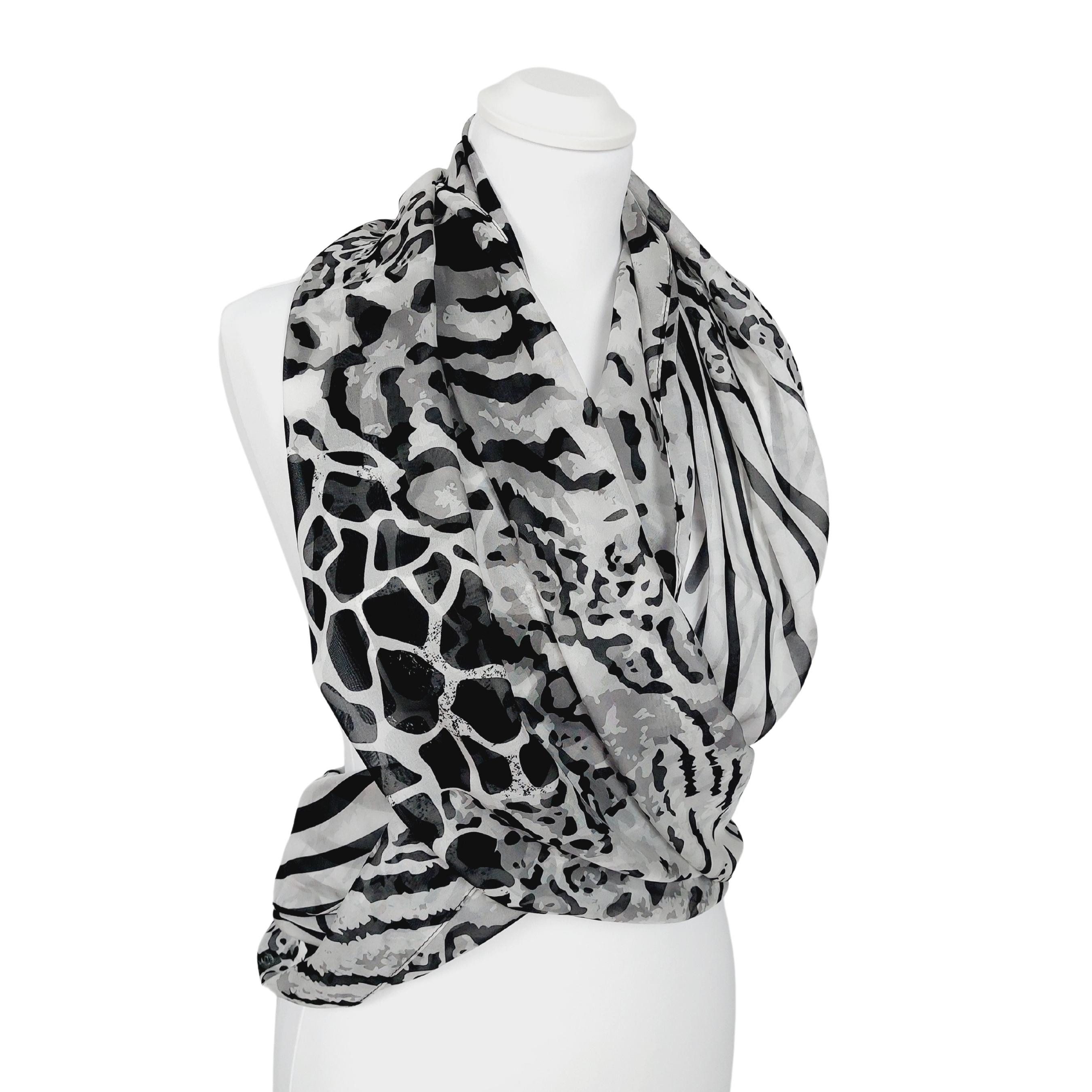 Seidenschals mit Animal-Print aus 100 % Seide Animal-Prints sind der absolute Dauerbrenner. Um unser Outfit perfekt zu machen, sind Seidenschals mit Leo-Muster das ideale Accessoire. Mit diesem Seidenschal in Animal-Design in dem Muster-Mix Leopard, Tiger, Giraffe und Zebra bereichern Sie auf jeden Fall Ihre Garderobe. Komplettieren Sie Ihren Look mit einem Seidenschal von TINITEX und machen Sie Ihr Outfit zu etwas Besonderem. Schal aus Seide mit Leopardenmuster Unterstreichen Sie Ihren eigenen Stil mit diesem wunderschönen Seidenschal mit Leopardenmuster. Das Besondere an diesem Schal ist der tierische Muster-Mix. Tiger-Prints, Leoparden-Design, Giraffen-Netz und markante Zebra-Streifen machen den Schal zu einem echten Hingucker. Der Schal besteht aus 100% Seide und fühlt sich angenehm weich auf der Haut an. Seide hat dazu noch die wundervolle Eigenschaft, bei Wärme zu kühlen und bei Kälte zu wärmen. Das Tragen eines Halstuch aus Seide hat deshalb sowohl im Winter als auch im Sommer Vorteile. Außerdem hat Seide die Fähigkeit sehr viel Feuchtigkeit aufzunehmen ohne sich dabei feucht anzufühlen. Mit diesem XXL-Schal aus Chiffon-Seide können Sie Ihr Outfit auf viele verschiedene Arten immer wieder neu interpretieren. Dabei kommt es vor allem auf die Bindetechniken an. Seidenschals lassen sich aber auch prima „zweckentfremden“: nicht nur als Halstuch sondern auch als Kopftuch, Haarband oder Bandana sind Seidenschals hervorragende Begleiter und Modeaccessoires. Leopard - Leo - Safari - Afrika Mittels einem Seidenschal mit Leomuster peppen Sie Ihr schlichtes Businessoutfit ganz einfach auf und schaffen einen eleganten Hingucker. Dieses ca. 180x65 cm großes Seidentuch mit Leoparden-Muster weckt die Sehnsucht nach Afrika. Träumen Sie sich mit diesem Leopardenschal auf Ihre eigene Safari in der Wildnis Afrikas.