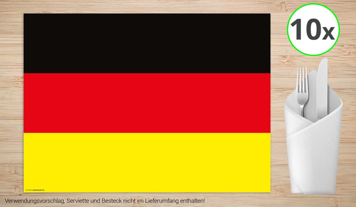 Diese Tischsets sind die perfekte Deutschland-Dekoration für deinen Esstisch und lassen das Essen bunter schmecken! Begeistere deine Gäste mit diesen besonders individuellen Platzsets und bringe frische Farbakzente in deine Deko. Jedes Tischset besteht aus hochwertigem, dickem Papier und ist mit lebensmittelechten Farben bedruckt. Die Sondergröße von 44 x 32 cm bietet genug Platz für Teller, Besteck und Getränk.