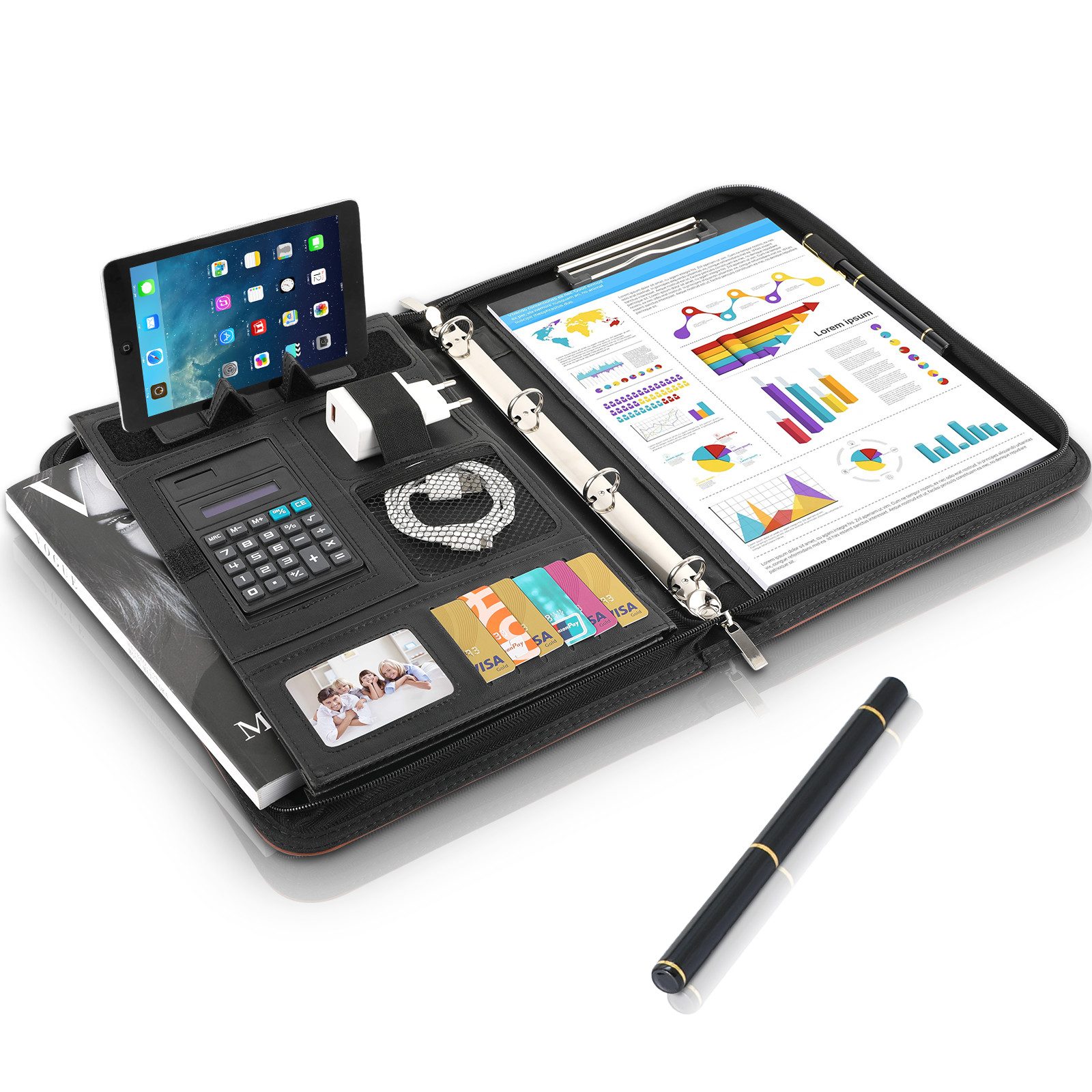 Konferenzmappe mit großem Fassungsvermögen: Schwarzer Schreibmappe mit klappbarem Griff. Die Außenseite des A4-Konferenzclips besteht aus PU-Leder, das wasserdicht Aktenmappe und leicht zu reinigen ist. Die Leder-Dokumentenmappe enthält einen 26-seitigen Notizblock, einen Taschenrechner, einen Markierstift, 4 Ringbuchklammern, 9 Kartenfächer und 10 Klarsichthüllen für Dokumente. Die Mappe mit Reißverschluss hat auch eine Seitentasche.