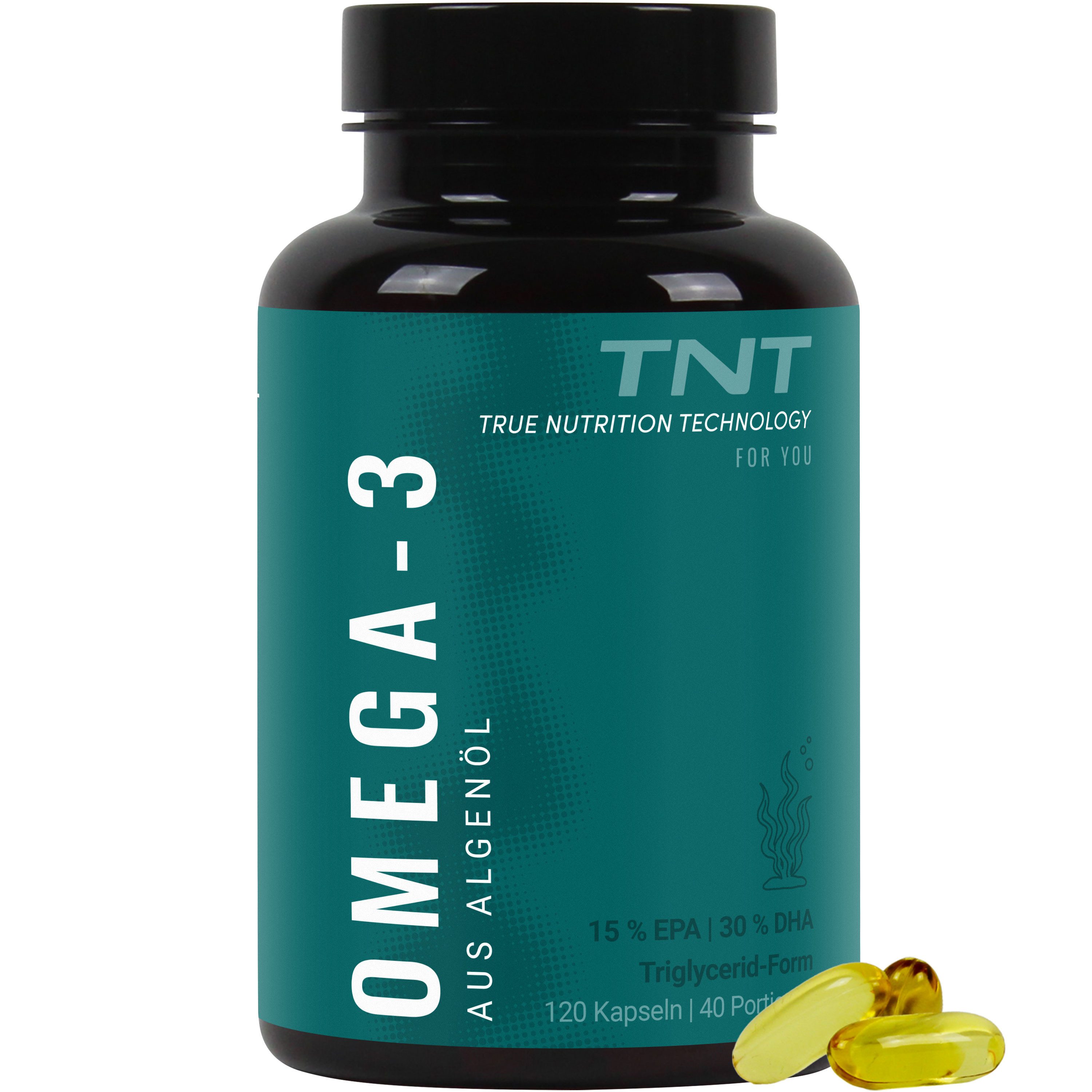 Die TNT Vegan Omega-3 Kapseln beinhalten hochwertiges Algenöl und sorgen dafür, dass du ausreichend mit den gesunden Omega-3 Fettsäuren versorgt werden kannst. Der rein pflanzliche Rohstoff Algenöl bringt ein 2:1 Verhältnis von DHA zu EPA mit sich. Wir haben uns bei den TNT Vegan Omega dazu entschieden, pro Kapsel 300mg DHA und 150mg EPA hinzuzufügen. Omega 3 Fettsäuren und vor allem deren Bestandteile DHA und EPA sind wichtige Pfeiler für Deine Gesundheit.