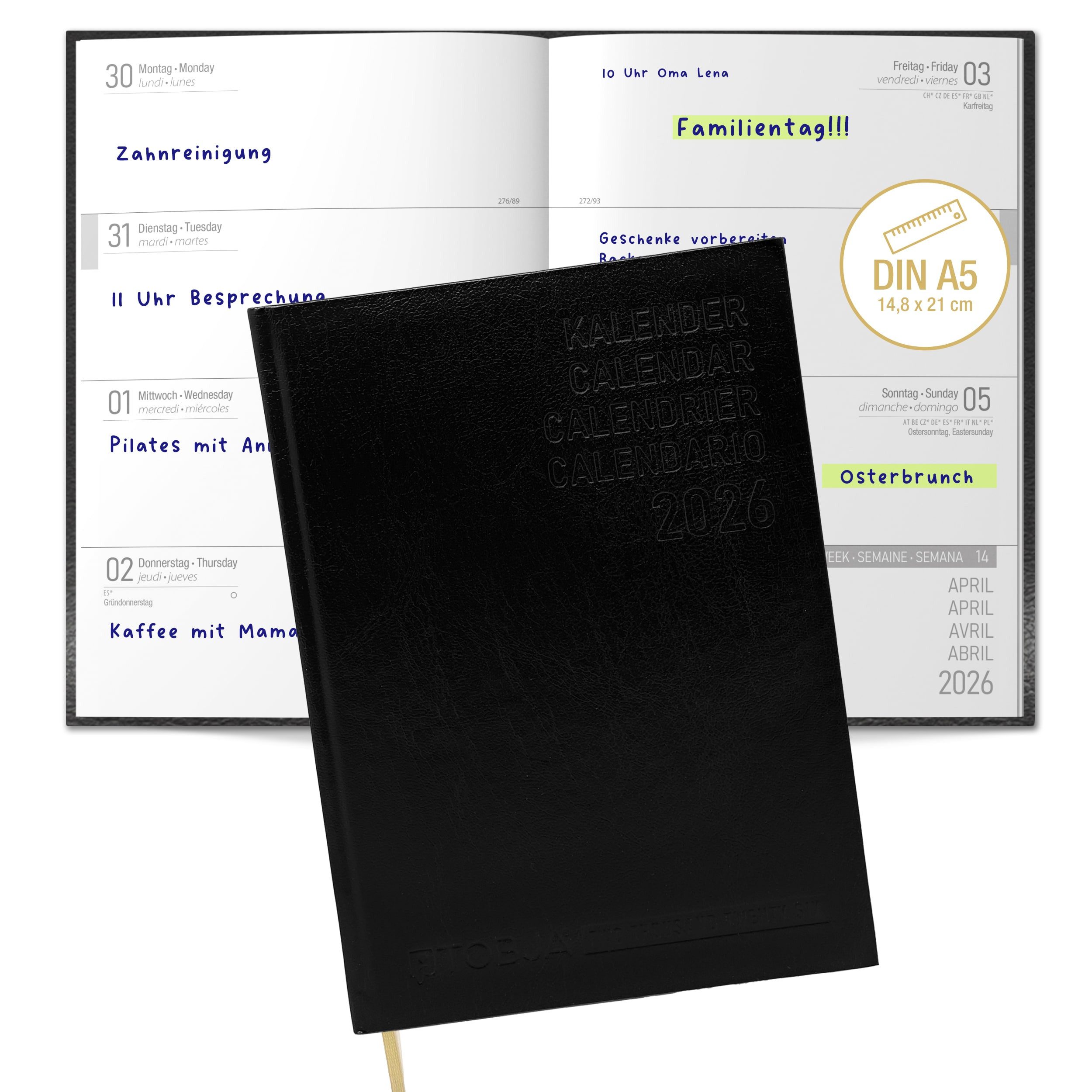 Das Format zwischen A5 und A4 (18,5 x 26 cm) bietet reichlich Platz für Notizen und bleibt dennoch handlich und kompakt. Das robuste und flexible Hardcover aus Lederimitat schützt Ihren Kalender zuverlässig und verleiht ihm eine elegante Optik. Ein praktisches Lesebändchen sorgt dafür, dass Sie jederzeit schnell die richtige Seite finden.