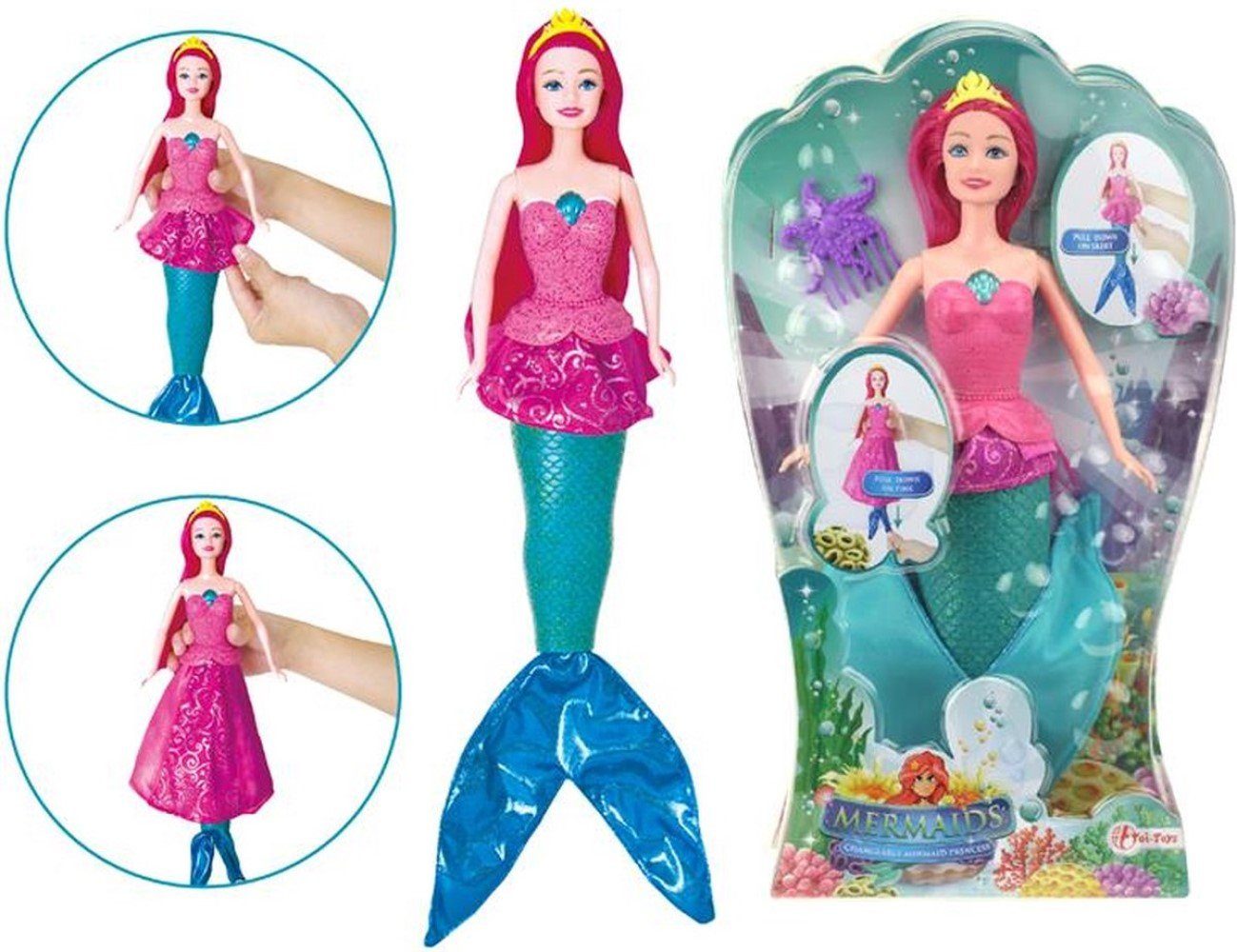 Das magische Kleid verbirgt ihren Fischschwanz und sie verwandelt sich in ein Mädchen, das an Land gehen kann.