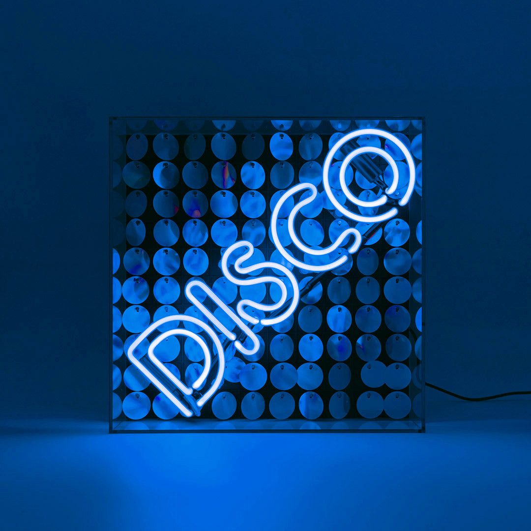 Erleben Sie die pulsierende Energie der Disco-Ära mit der handgefertigten Neon Box "Pailletten Disco" von TOM NEON. Diese stilvolle Leuchte bietet: