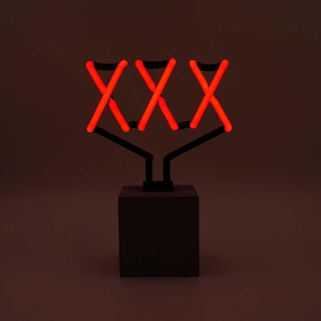 Verleihen Sie Ihrem Raum mit dem handgefertigten Neon Schriftzug "XXX" von TOM NEON einen Hauch von Kühnheit. Diese Tischlampe aus echtem rotem Glas bietet: