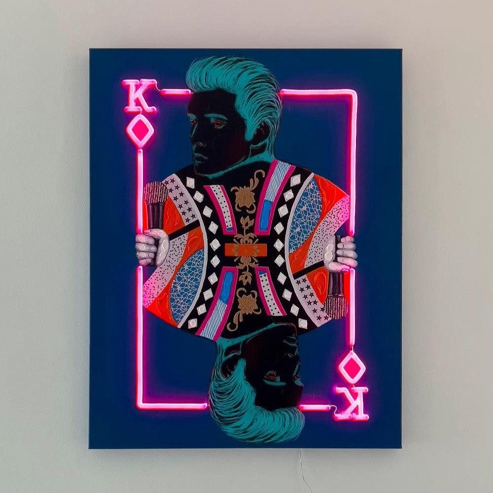 Präsentieren Sie den unvergleichlichen Elvis Presley in seiner ganzen Pracht mit unserem einzigartigen Elvis Neon Bild. Dieses kunstvolle Kunstwerk zeigt Elvis als Karo König und bringt einen Hauch Musikgeschichte in Ihr Zuhause.