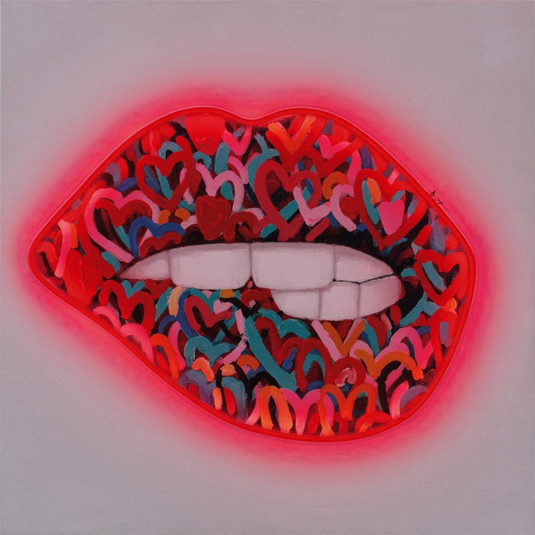 Verleihen Sie Ihren Räumen mit unserer handgemalten LED Neon Wall Art eine lebendige Note! Das Kunstwerk zeigt einen verführerischen Mund, der auf eine Lippe beißt, und bietet: