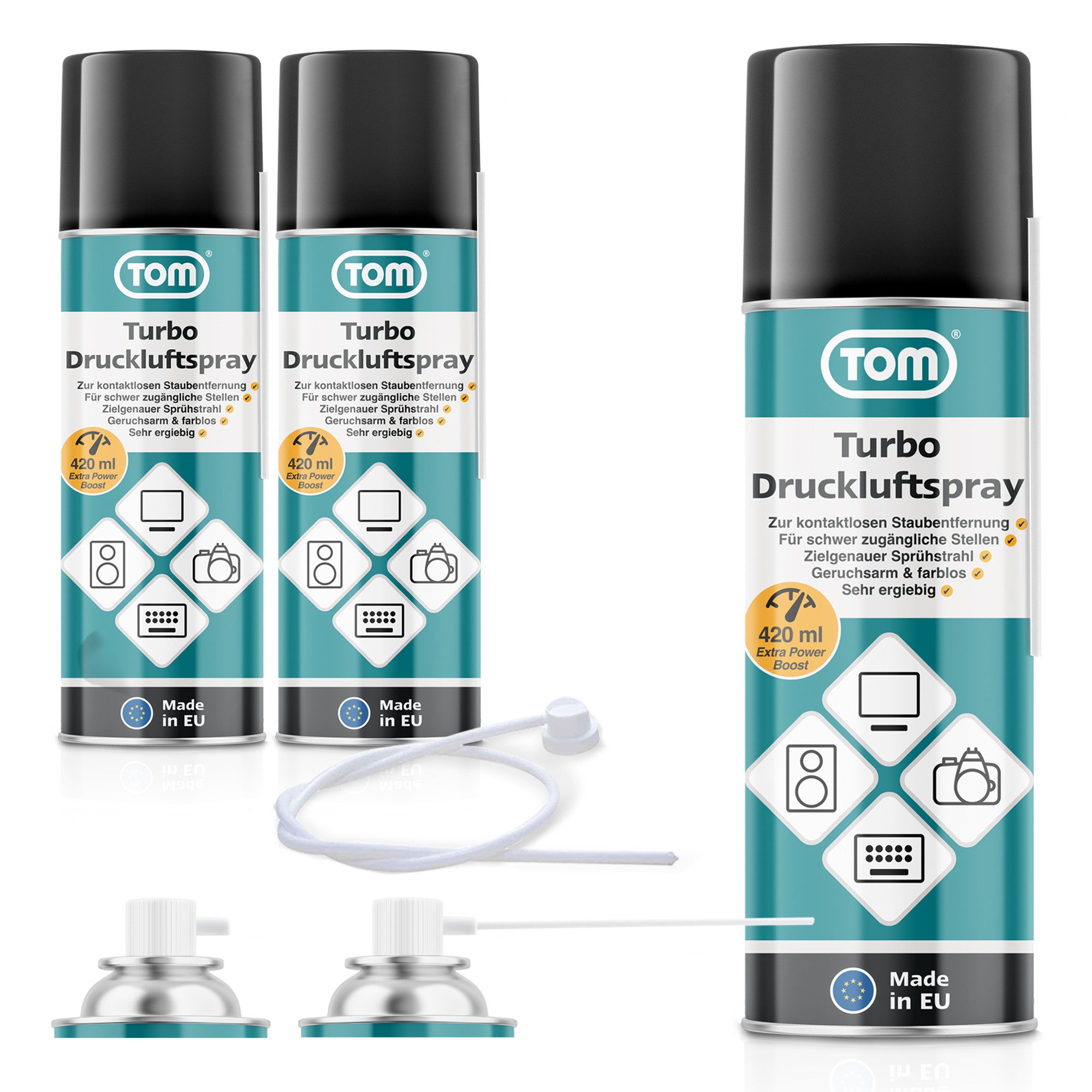 Das TOM Power Druckluftspray entfernt Staub, Schmutz & Flusen aus schwer erreichbaren Bereichen. Ideal für elektronische Geräte, Auto-Interieur, Tastaturen & andere empfindliche Oberflächen.