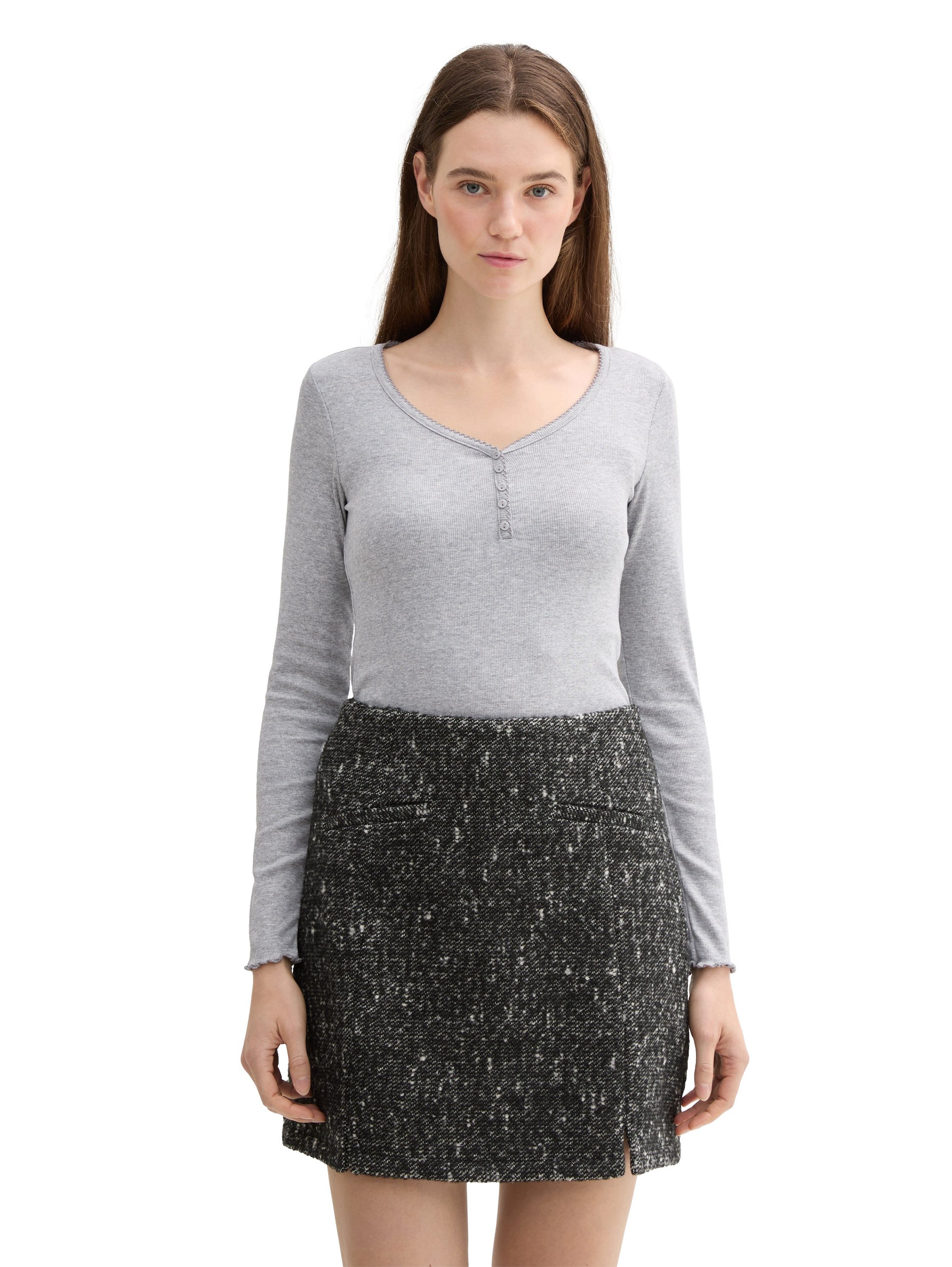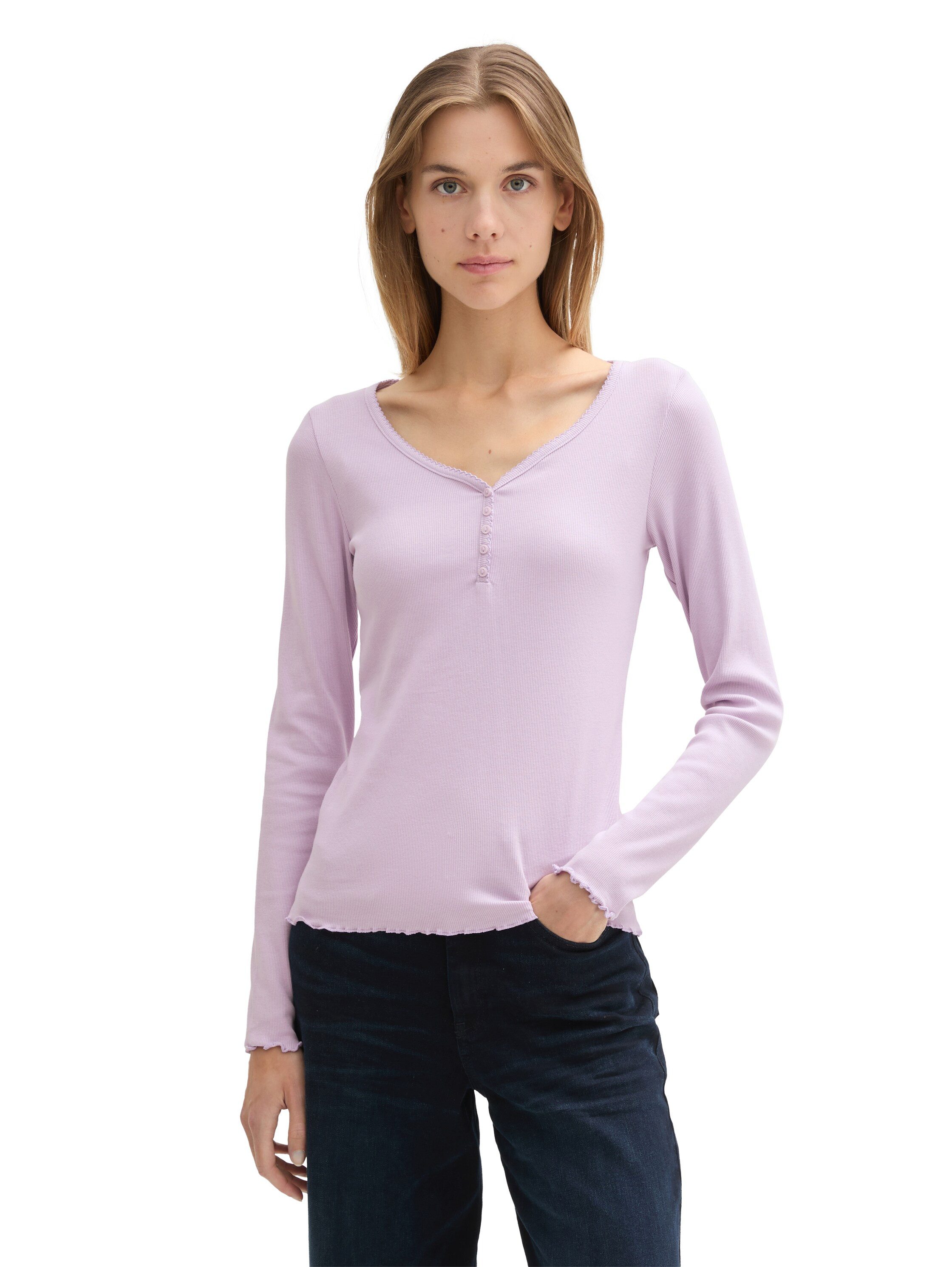 Mit dem Langarmshirt von TOM TAILOR Denim stellst du im Handumdrehen ein neues Outfit zusammen. Die langen Ärmel enden in einem gewellten Abschluss. Dieses Shirt hat einen V-Ausschnitt mit Knopfleiste und ist taillenbedeckend sowie basic geschnitten, sodass dein Oberkörper dezent in Szene gesetzt wird.