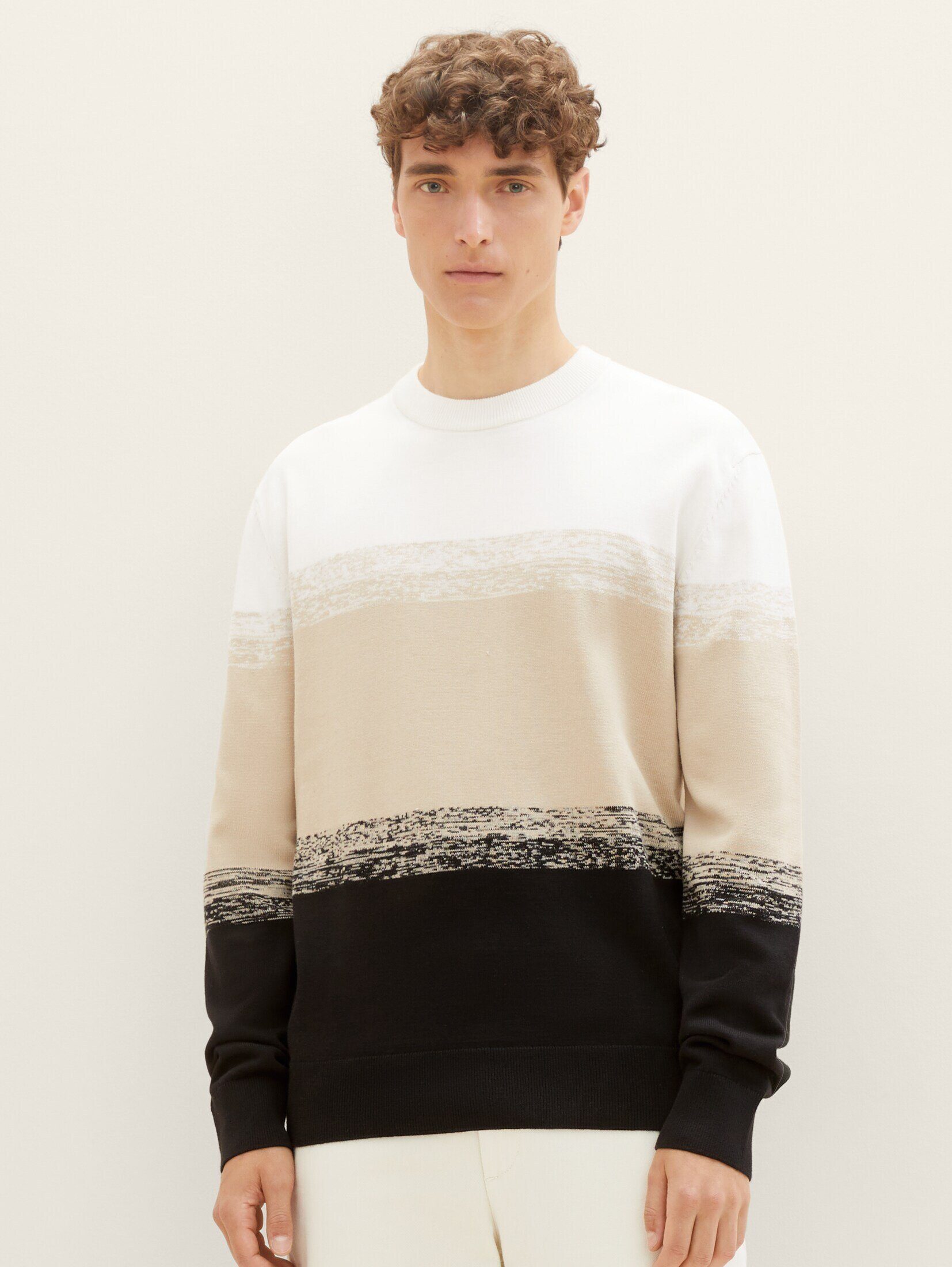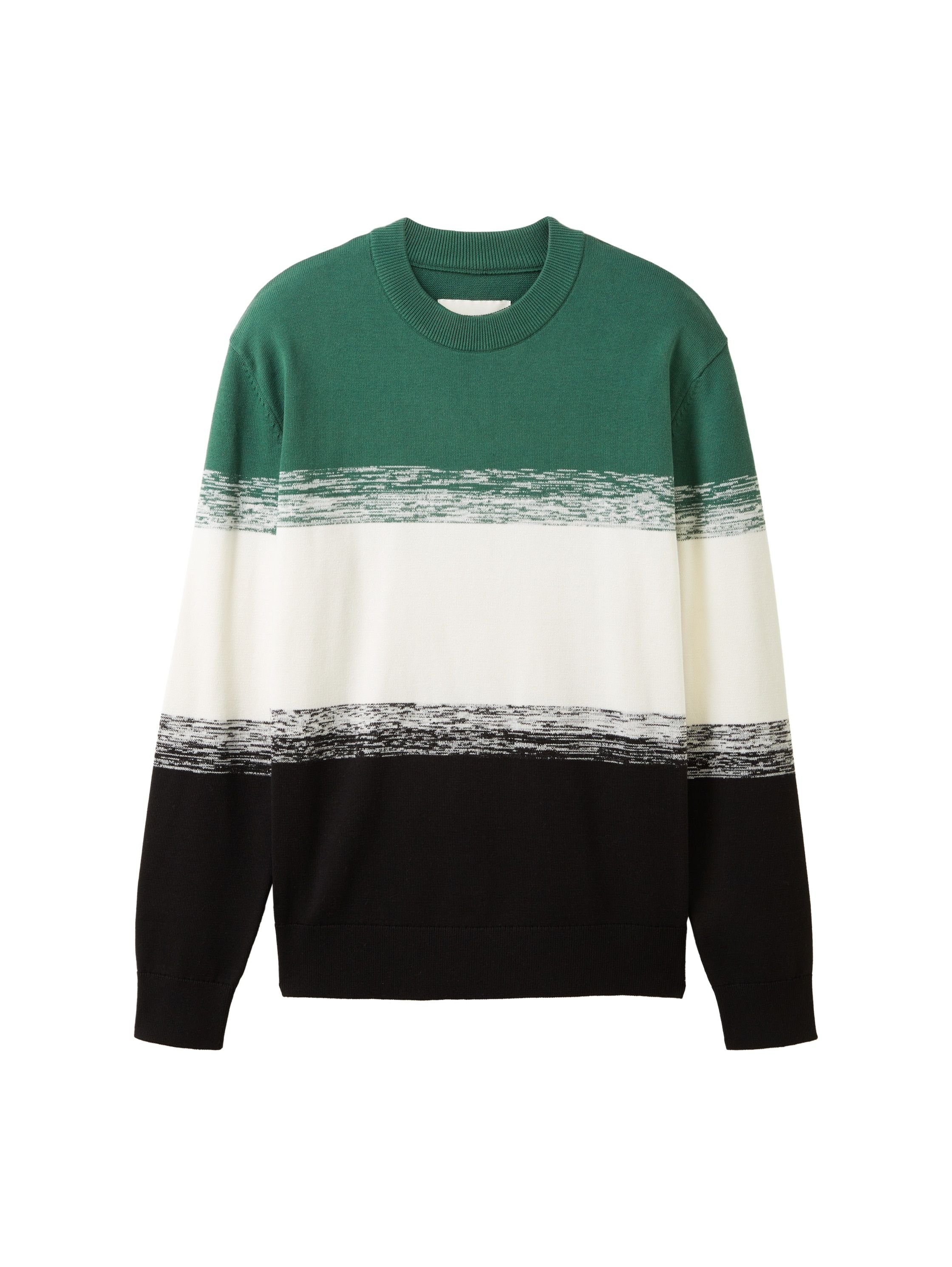 Mehrfarbiger Strickpullover für Männer (langärmlig mit Rundhalausshnitt) aus weicher Baumwolle, mit Flag-Label, mit Farbverlaufsstreifen, mit abgesetzten Rippbündchen