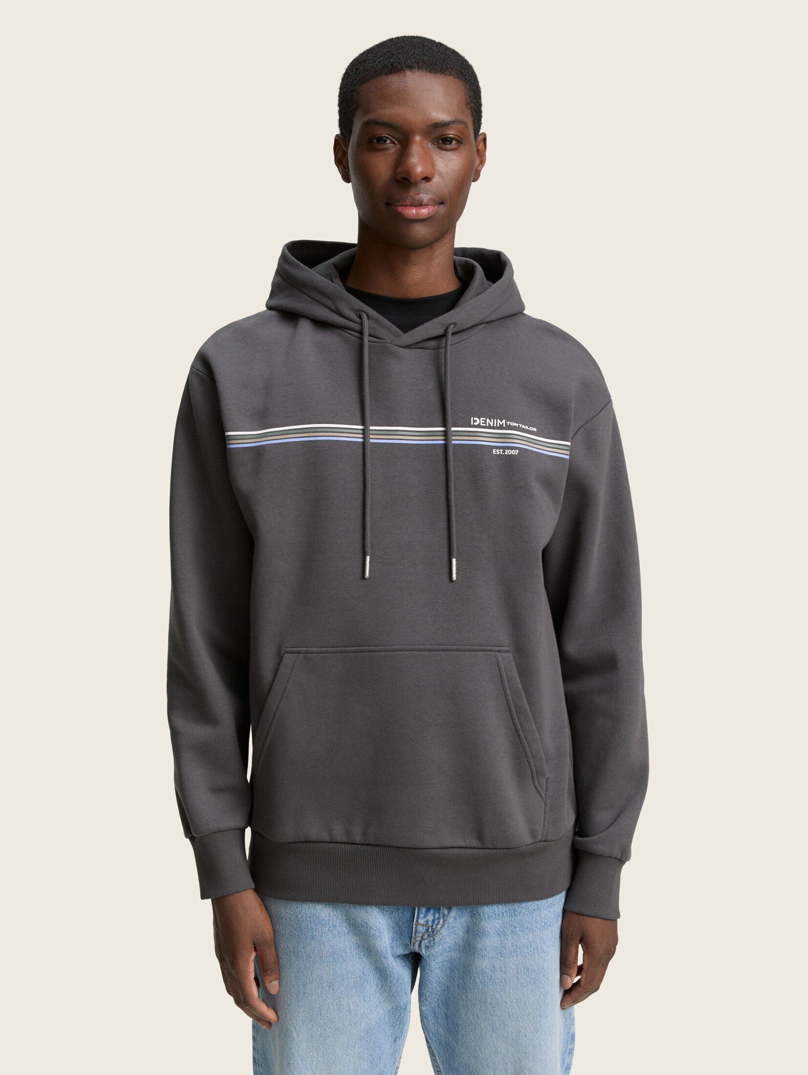 Mit dem Hoodie von TOM TAILOR Denim stellst du im Handumdrehen ein neues Outfit zusammen. Der Logodruck sorgt für eine individuelle und trendige Note. Dieser Hoodie hat eine angesetzte Kapuze. Die langen Ärmel enden in einem Bündchen, das für guten Sitz sorgt. Dieses Sweatshirt ist taillenbedeckend sowie basic geschnitten, wodurch dein Oberkörper locker umspielt wird. Am Bauch ist eine Kängurutasche aufgenäht, in der du dir deine Hände wärmen kannst und die gleichzeitig lässig aussieht.