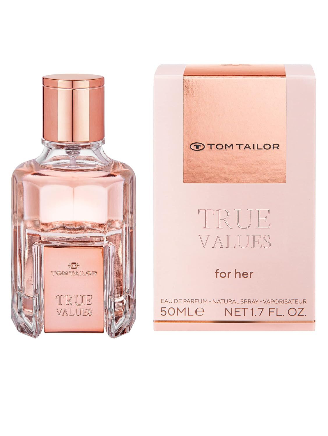 TOM TAILOR TRUE VALUES Eau de Parfüm 50ml für Sie kombiniert blumige, fruchtige und grüne Noten. Der zarte, von Orangenblättern dominierte Zitrusfrucht-Auftakt des Duftes ist der Auftakt zu einer zart-blumigen Herznote mit fruchtigen Nuancen. Es mischt Töne von Pfingstrose, Lilie, Magnolie und Nektarine, die zusammen den natürlichen Charakter der gesamten Komposition unterstreichen. In der Basis verbinden sie sich mit Sandelholz, Moschus und Amber, die ein Gefühl von Sanftheit und natürlicher Eleganz vermitteln, das von innen heraus strahlt. Der Duft vermittelt ein tiefes Gefühl von Aufrichtigkeit und unterstreicht die starke Persönlichkeit seiner Trägerin. Der Flakon ist in einem Apricot-Ton gehalten, der seine Weiblichkeit unterstreicht. Der Metallclip am Boden rahmt den Flakon eindrucksvoll ein und erinnert gleichzeitig an ein starkes Lebensfundament. Die Vorderseite des Flakons ist mit strukturierten Elementen verziert, die ein haptisches Erlebnis schaffen und so den unverwechselbaren Gesamteindruck des Duftes verstärken.