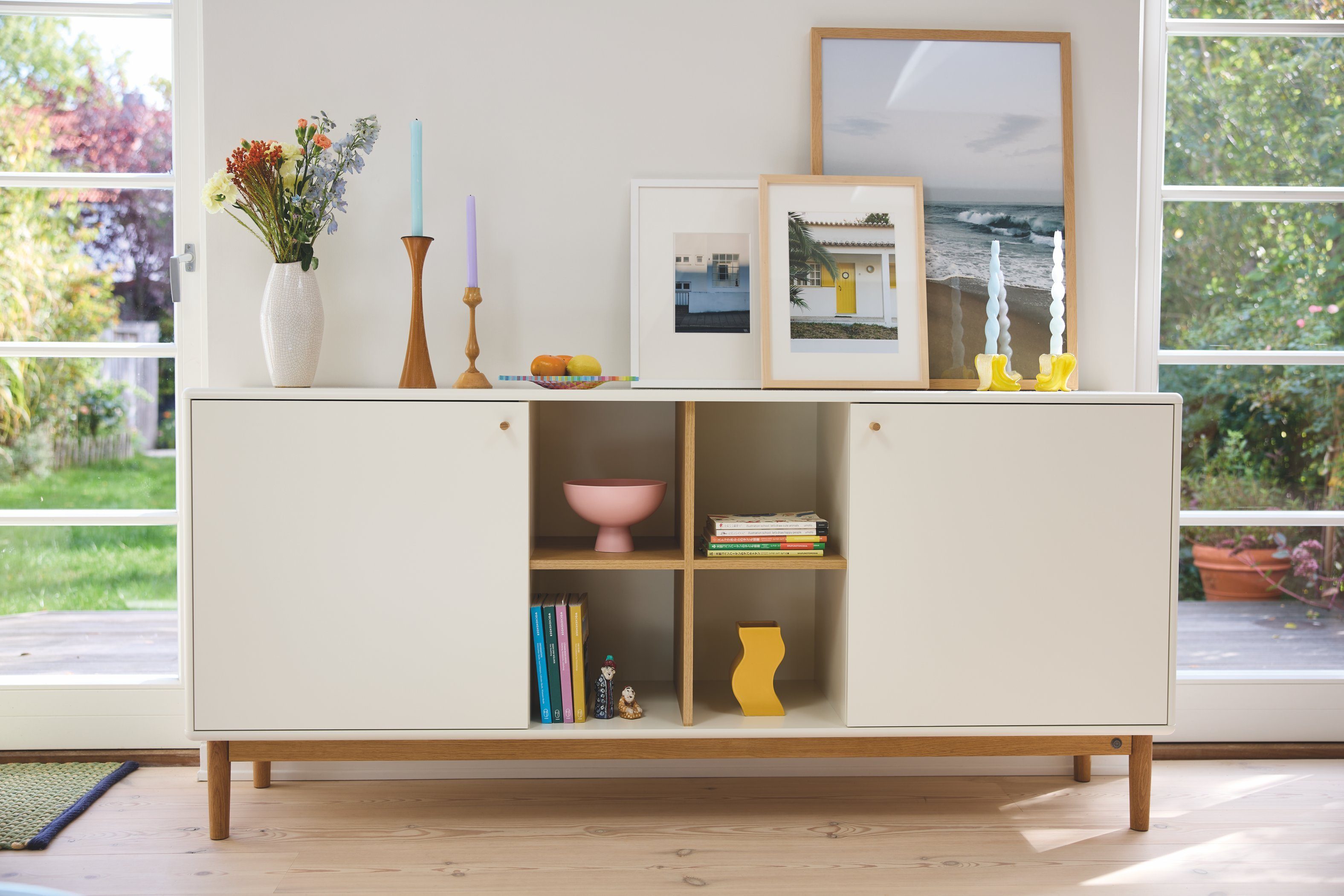 Serienhinweise | Die Serie COLOR LIVING verbindet eine gefällige Retroform mit gerundeten Kanten und Eichedetails an Griffen und in den markanten offenen Regalfächern. Erhältlich in vier attraktiven Lackfarben: beige, deep sea blue, eucalyptus und der Modefarbe lilac. |