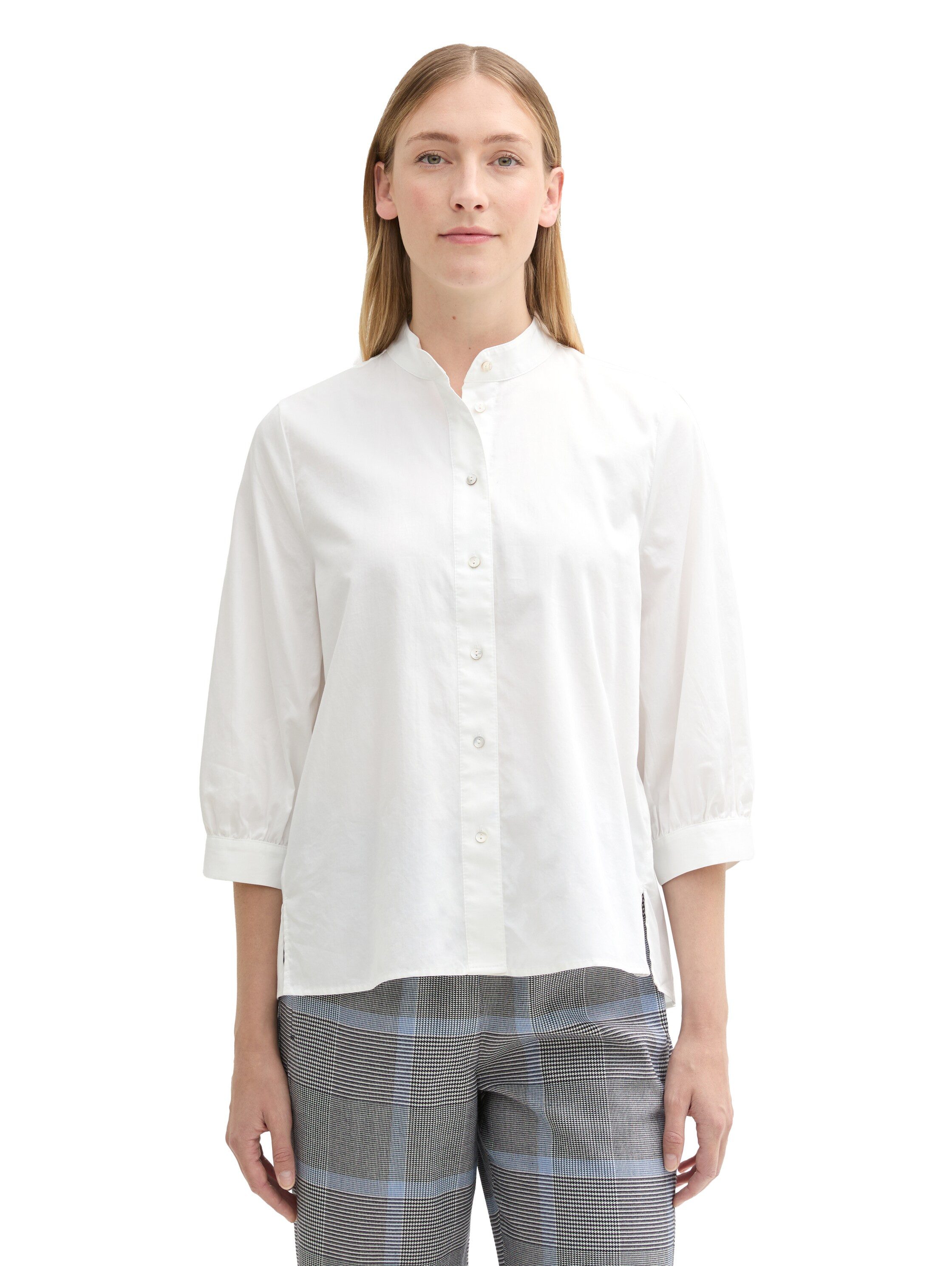 Die Langarmbluse von TOM TAILOR ist sowohl bei schicken Anlässen als auch im Büro eine gute Option. Der Stehkragen steht nach oben und liegt am Hals an, wodurch du seriöse und toughe Outfits kombinieren kannst. Die 3/4-langen Ärmel enden in einem Bündchen, das für guten Sitz sorgt. Diese Bluse ist taillenbedeckend sowie locker geschnitten, sodass du dich wohlfühlst. Das Oberteil hat Seitenschlitze, die dir mehr Bewegungsfreiheit bieten.