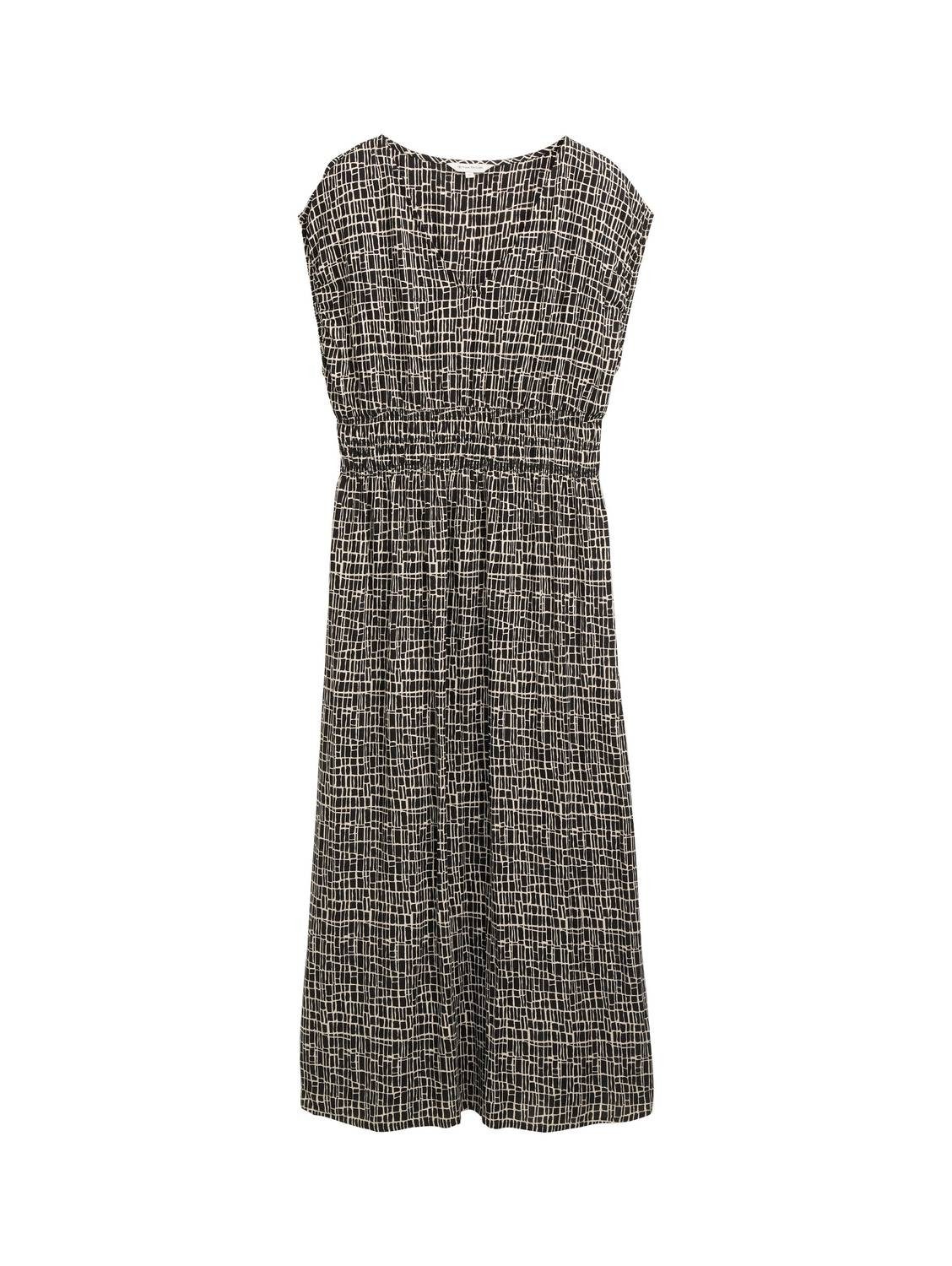 Leicht, luftig und voller Bewegung: Dieses gemusterte Midi-Kleid aus reiner Viskose ist ein stilvoller Allrounder für sonnige Tage. Der V-Ausschnitt und die elastische Taillenpartie mit Smock-Details betonen dezent die Silhouette, während der Loose Fit für angenehme Leichtigkeit sorgt.