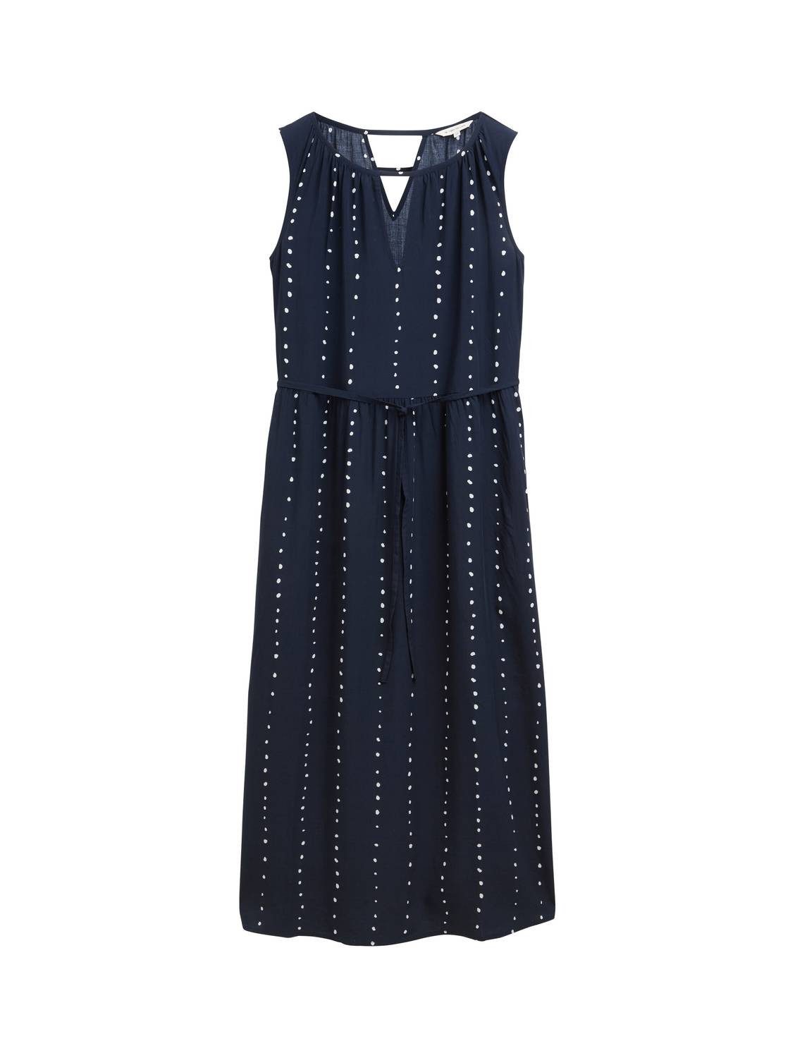 Dieses Maxi-Kleid überzeugt mit seinem gemusterten Design und dem locker-lässigen Schnitt. Es ist ärmellos und verfügt über seitliche Eingriffstaschen, die dem Kleid nicht nur praktische Funktionalität verleihen, sondern auch für einen entspannten Look sorgen. Ein Bindegürtel an der Taille betont die Figur, während die Seitenschlitze mehr Bewegungsfreiheit bieten.
