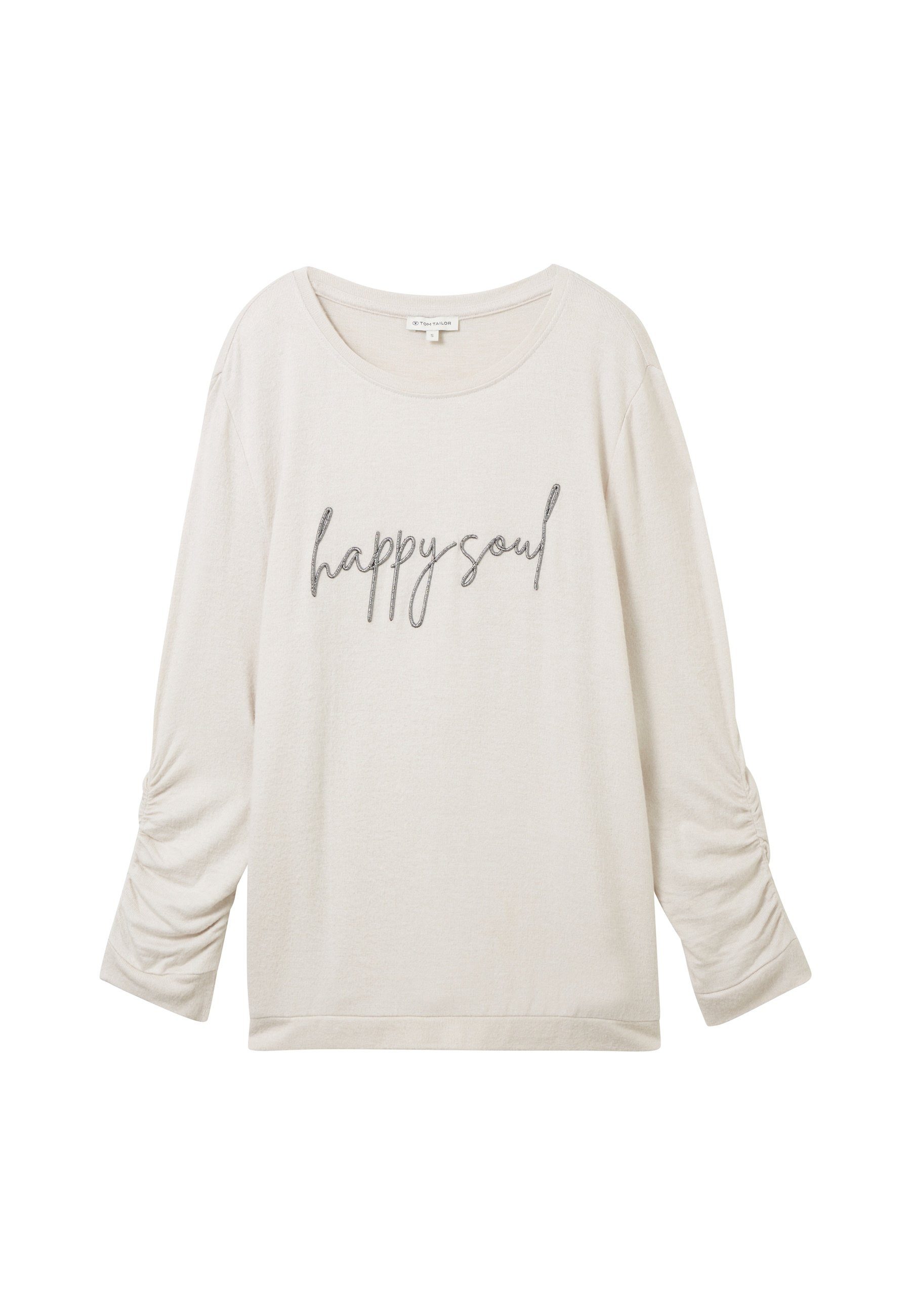 Dieses Sweatshirt von Tom Tailor ist ein lässiges und feminines Kleidungsstück für jeden Tag. Es ist aus einem angenehmen Stoff gefertigt und hat einen Rundhalsausschnitt und 3/4 Ärmel. Das Besondere an diesem Sweatshirt ist die Raffung an den Ärmeln, die für einen verspielten Look sorgt. Auf der Vorderseite ist ein Frontstick angebracht, der das Happy Soul zeigt. Das Sweatshirt hat einen Regular Fit und bietet einen hohen Tragekomfort. Es ist in verschiedenen Farben erhältlich und lässt sich leicht mit anderen Teilen kombinieren. Dieses Sweatshirt von Tom Tailor ist aus hochwertigen Materialien hergestellt und zeugt von einer guten Verarbeitung. Es ist ein tolles Basic für jede Garderobe.