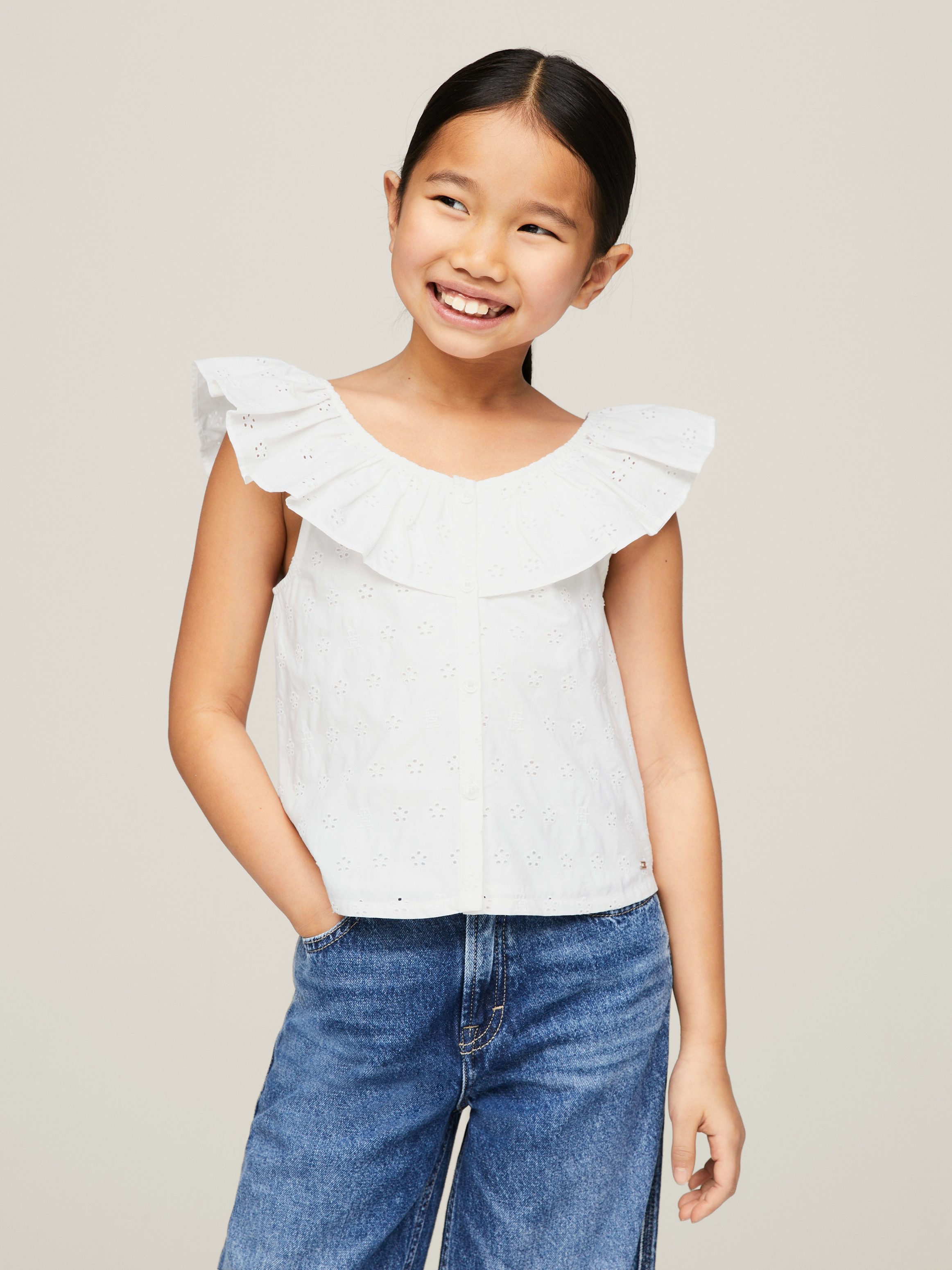 Ob Mode-Blogger oder nicht — in dieses Babydollshirt »BRODERIE ANGLAISE FRILL TOP« der Marke Tommy Hilfiger werden sich alle Mädels verlieben. Mit Logostickereien sieht es verspielt und charmant aus. Die Knopfleiste ist praktisch beim Anziehen und sieht auch noch frech aus. Das Shirt hat einen Rundhalsausschnitt und ist geschnitten, sodass sich Teenies frei bewegen können.