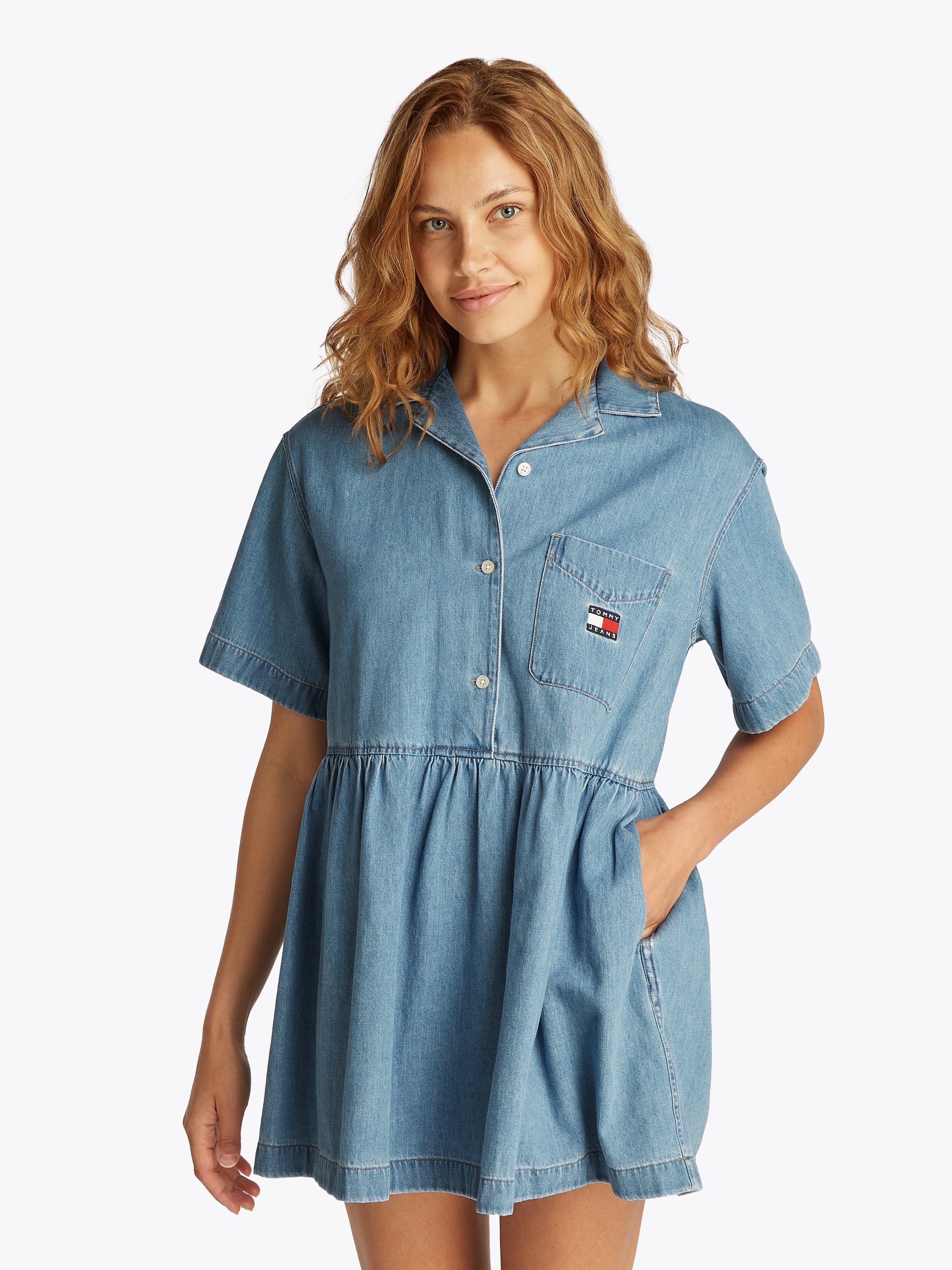 Das kurze Jeanskleid »TJW LT DENIM DRESS EXT« von Tommy Jeans passt zu einem casual Auftritt. Der großzügige Schnitt schmeichelt jeder Figur. Der Umlegekragen wirkt sehr seriös und elegant.