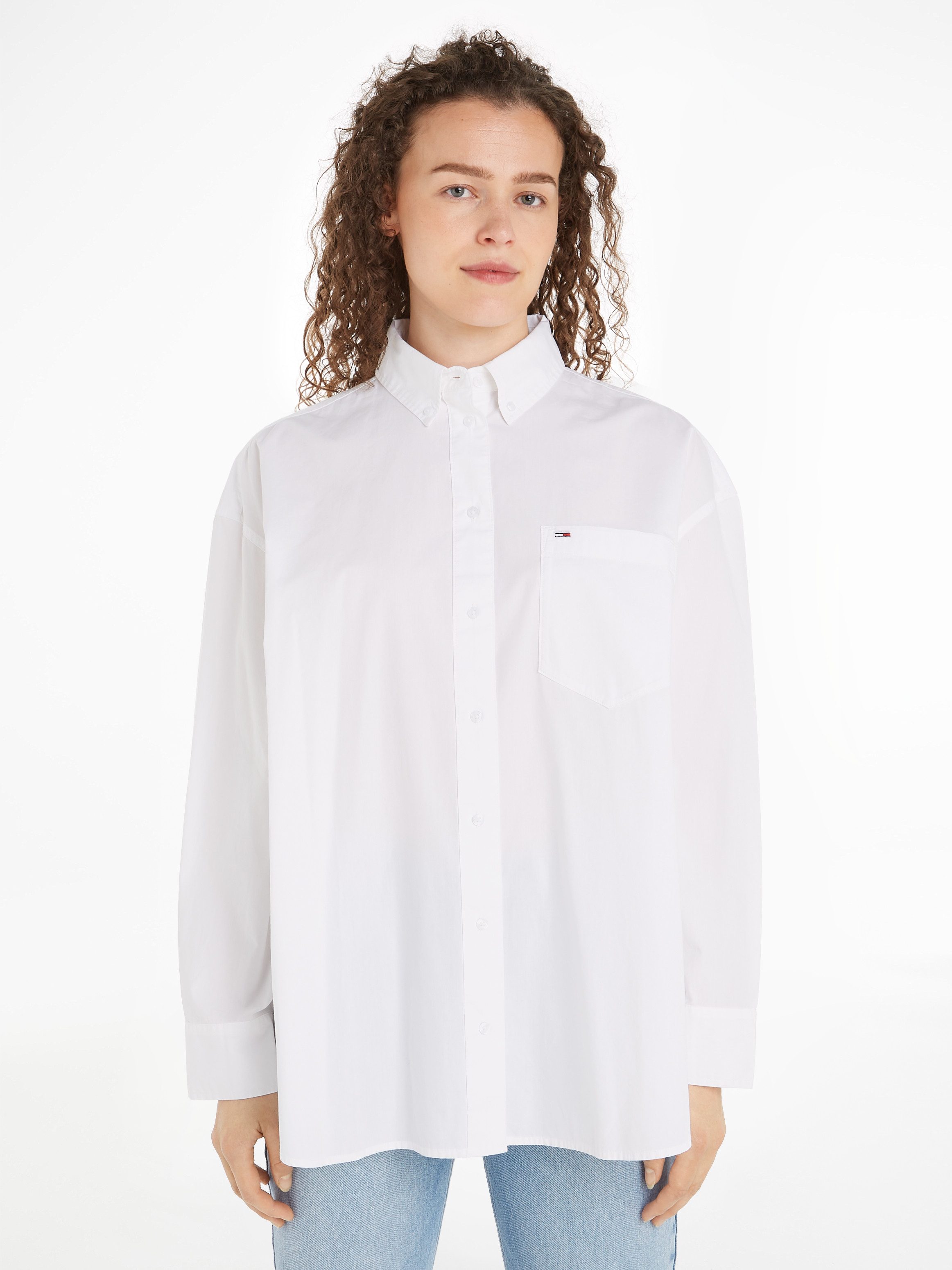 Mit der Shirtbluse »TJW OVS ESSENTIAL SHIRT EXT« von Tommy Jeans lassen sich schnell neue Styles kombinieren. Die Shirtbluse hat eine Knopfleiste. Diese Bluse ist weit geschnitten, sodass dein Oberkörper lässig umspielt wird.