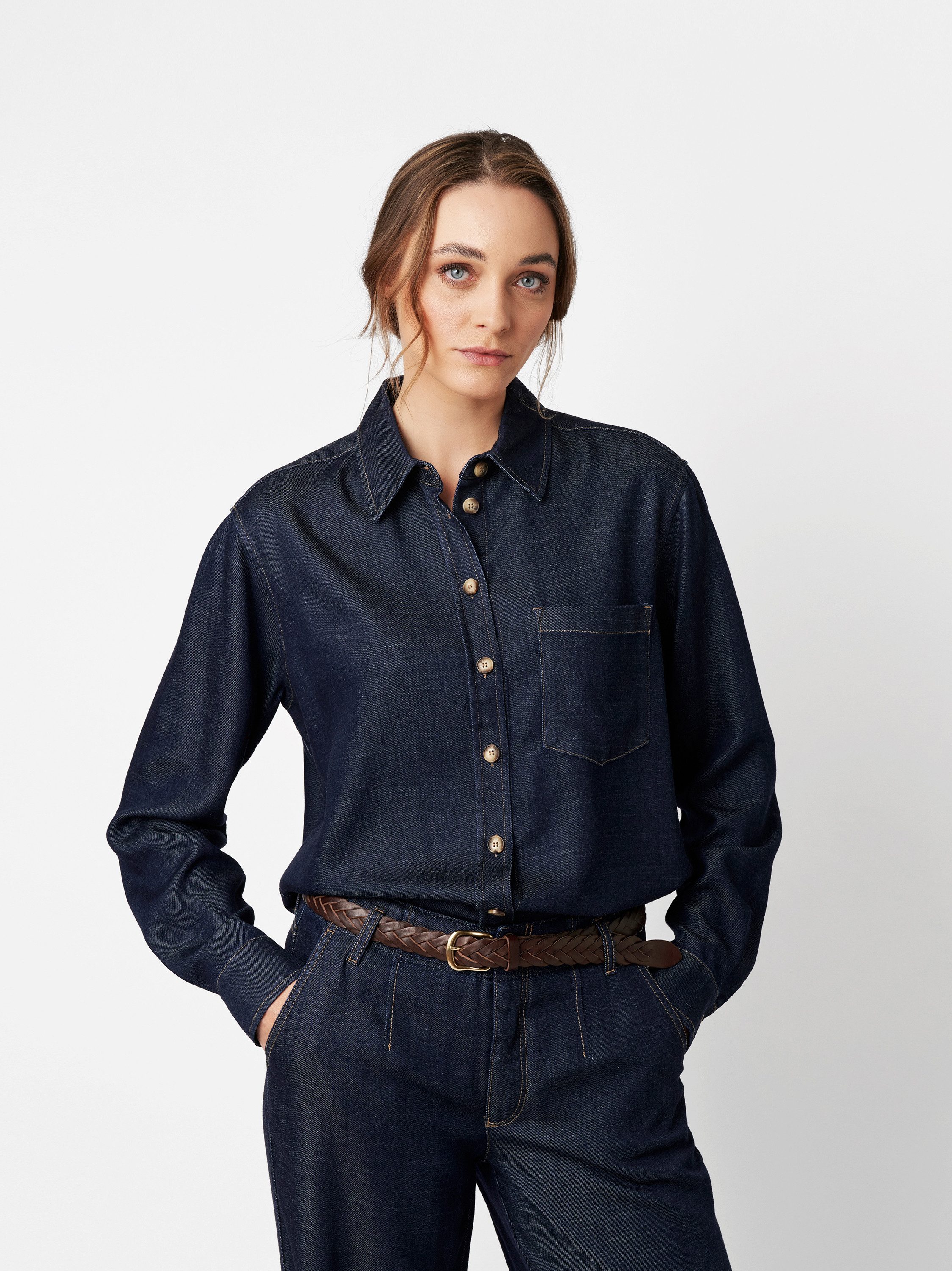 Der Jeansstoff aus Viskosemischung ist sehr strapazierfähig, so wirst du lange Freude an deinem Oberteil haben.