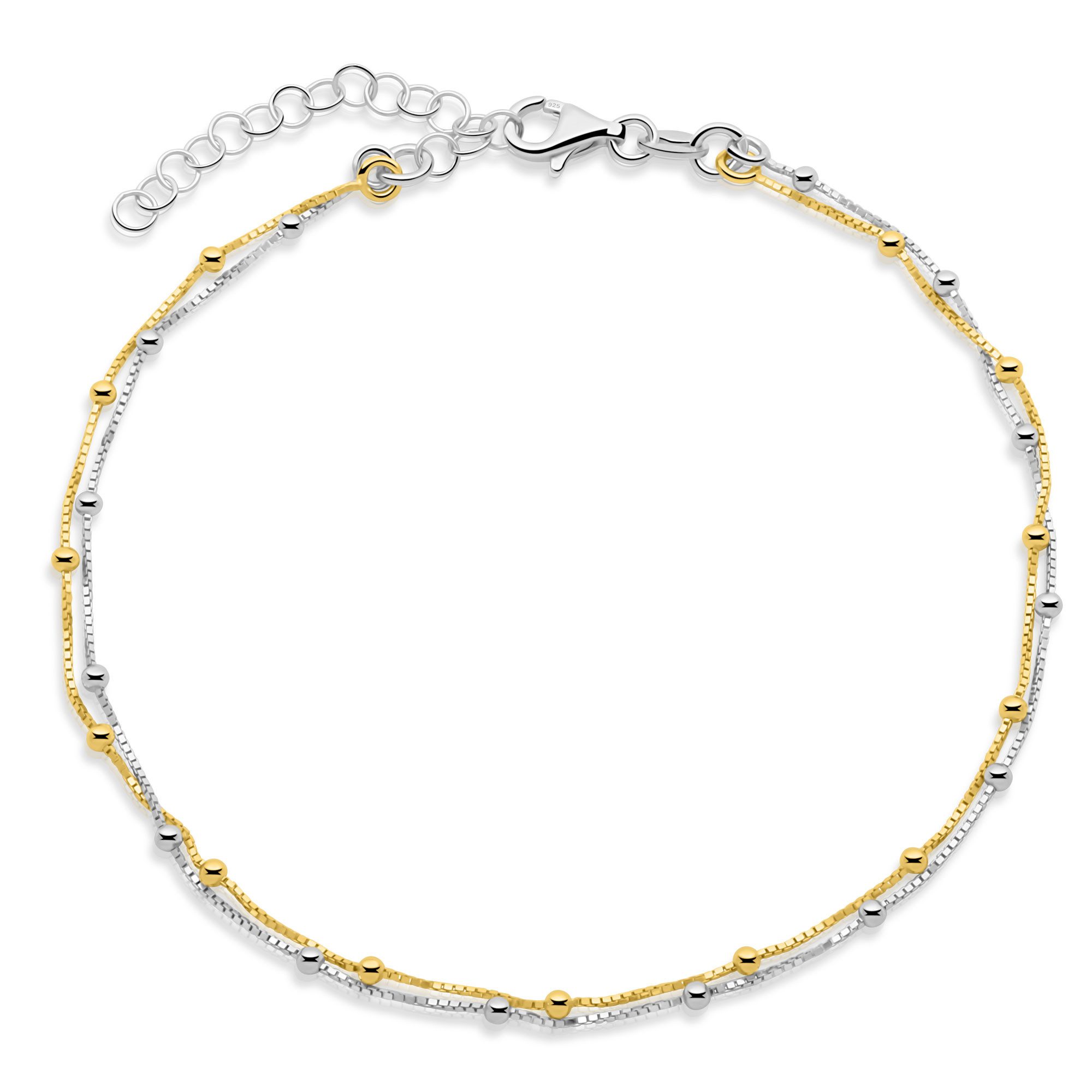 Entdecken Sie die elegante Fußkette aus 925er Sterling Silber, die modernes Design mit zeitloser Schönheit vereint. Diese exquisite Venezianerkette in einem stilvollen zweifarbigen Look kombiniert schimmerndes Silber mit edlem Gold und setzt so geschmackvolle Akzente an Ihrem Fußgelenk. Mit einer filigranen Kettenbreite von 0,8 mm umschmeichelt sie zart Ihre Haut und verleiht jedem Schritt eine feminine Note. Die Fußkette ist nicht nur optisch ansprechend, sondern auch von höchster Qualität. Sie besteht aus gestempeltem 925er Sterling Silber, was für ihre Langlebigkeit und Echtheit steht. Die hochglanzpolierte und rhodinierte Oberfläche sorgt dafür, dass sie ihren strahlenden Glanz über lange Zeit behält, während die 585er Vergoldung ein luxuriöses Finish verleiht. Mit einer verstellbaren Длина von 22 - 26 cm passt sich die Kette ideal an jedes Fußgelenk an und bietet dabei optimalen Tragekomfort. Der stabile Karabinerverschluss ermöglicht ein einfaches Anlegen und gewährleistet gleichzeitig einen sicheren Halt, sodass Sie die Kette unbesorgt tragen können. Ob als besonderes Highlight zu Ihren Sommeroutfits oder als stilvolles Accessoire für besondere Anlässe – diese Fußkette ist das perfekte Schmuckstück für modebewusste Frauen. Ein Must-have, das Eleganz und Raffinesse in Ihre Schmuckkollektion bringt!