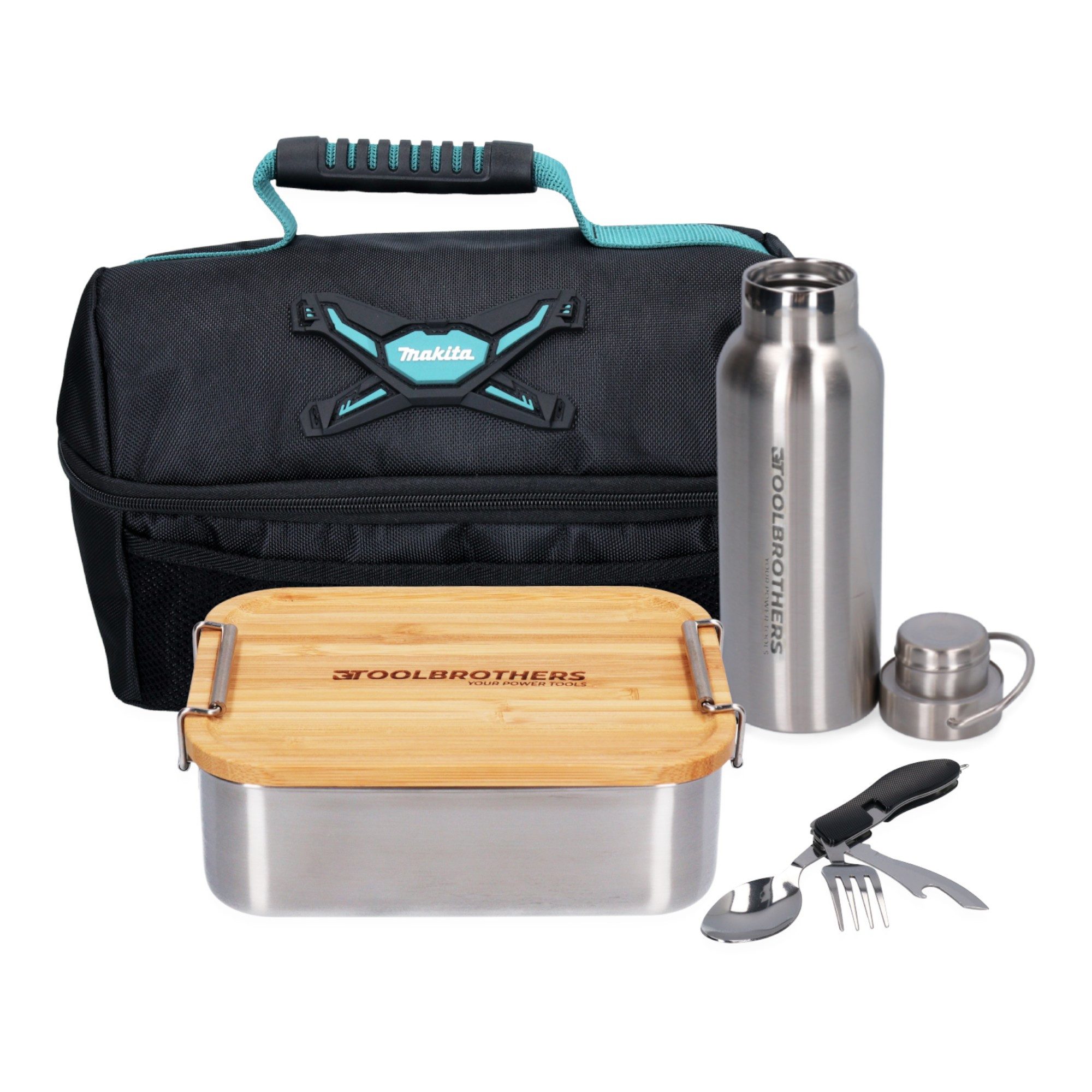 Всеs an einem Ort! Das ist Sinn und Zweck von diesem hochwertigen Set. Die Makita Isoliertasche hält sorgfältig und zuverlässig die Temperatur der Lebensmittel. Damit jederzeit an jedem Ort gespeist werden kann, ist ein Multifunktionales Universalbesteck im Set enthalten. Dies beinhaltet ein Messer, einen Löffel, eine Gabel sowie einen Flaschenöffner für das "kühle Getränk" nach Feierabend. Darüber hinaus ist eine Toolbrothers Fan Edelstahl Trinkflasche mit einem Füllvolumen von 500 ml mit dabei. Des Впередen ist die hochwertig verarbeitete Brotdose aus dem Hause Toolbrothers der perfekte Begleiter für jeden hungrigen Handwerker.