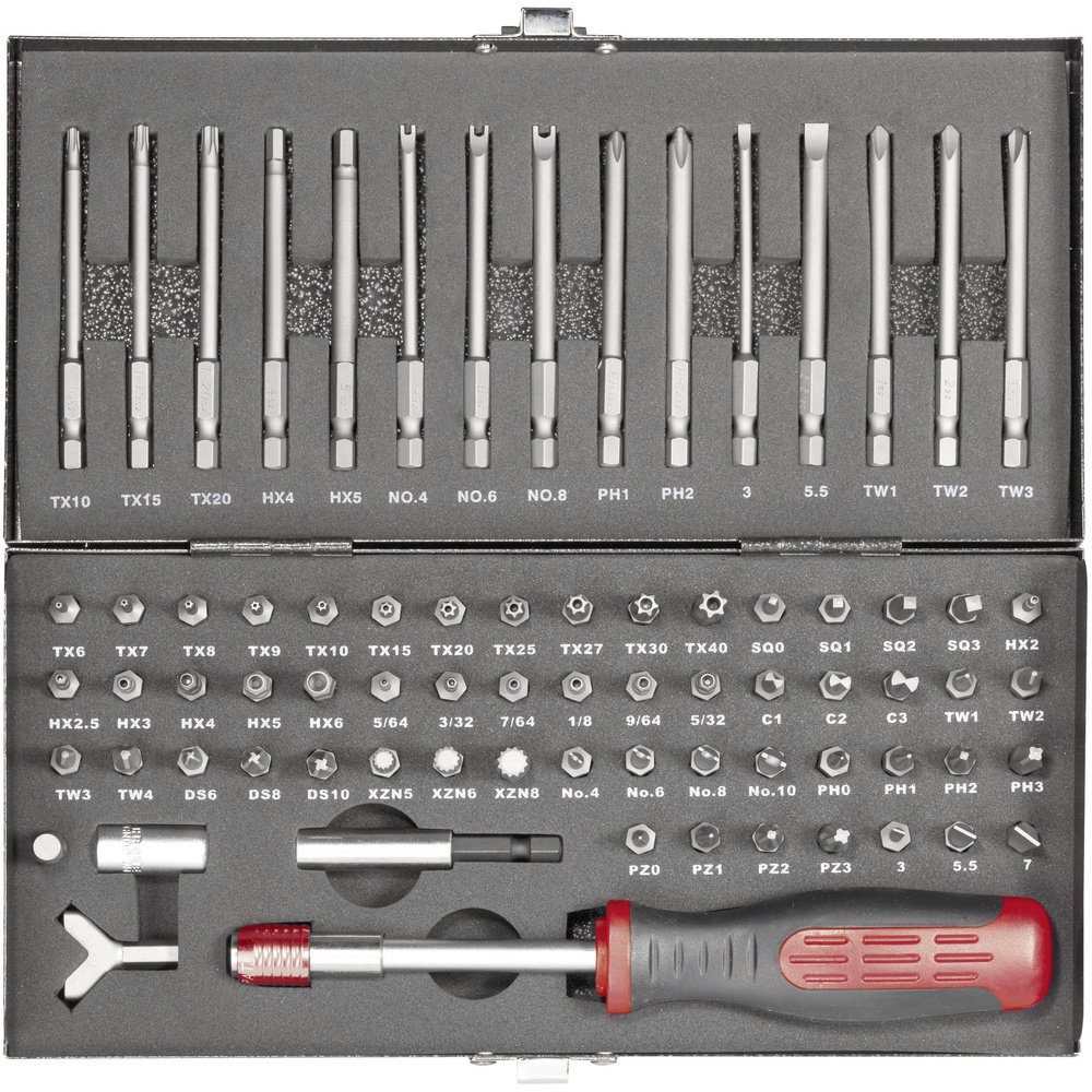 6 Innensechskant-Bits, metrisch, mit Innenbohrung, 2 - 6 mm · 6 Innensechskant-Bits, zöllig, mit Innenbohrung, 2 - 4 mm (5/64" - 5/32") · 14 T-Profil-Bits mit Innenbohrung, TX 6 - TX 40 · 3 Clutch-Einsätze C1 - C3 · 4 Innenvierkant-Bits, SQ 0 - SQ 03 · 4 TRI-WING-Bits, TW 1 - TW 4 · 3 TORQ-Set®-Bits, TS 6/TS 8/TS 10 · 3 XZN-Vielzahn-Bits, Gr. 5/6/8 · 4 Klauenschlüssel-Bits, No. 4 - No. 10 · 4 Kreuzschlitz PH 0 - PH 3 · 4 Kreuzschlitz PZ 0/1/2/3 · 3 Schlitz 3/5,5/7 mm · Adapter mit Außenvierkant und Außensechskant 6,3 mm (1/4") · Spezialeinsatz zum zentrischen Spannen von Schraubhaken, etc. · Adapter mit Innenvierkant und Innensechskant 6,3 mm (1/4") · Maschinen-Bithalter 6,3 mm (1/4") für Bohr- und Elektroschrauber, Bohrmaschinen · Bithalter 6,3 mm (1/4") · 15 Tieflochbits (80 mm): Tri-Wing 1/2/3 · Schlitz 3,0/5,5 mm · Kreuzschlitz PH1/PH2 · Klauenschlüssel 4/6/8 · Innensechskant mit Bohrung 4/5 · T-Profil mit Bohrung TX10/TX15/TX20 · Stabile Stahlbox