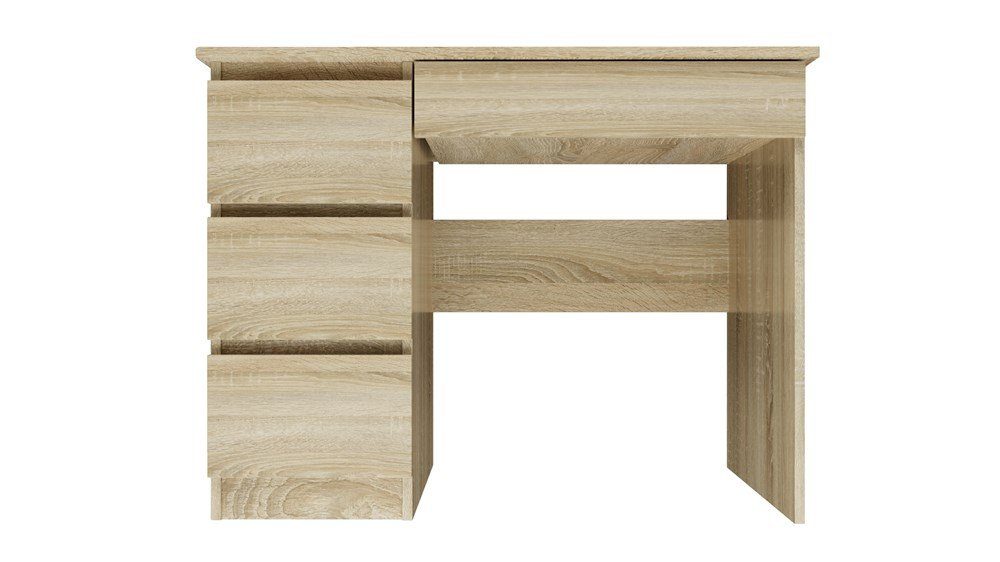 Home-Office Schreibtisch: Platzsparender Arbeitstisch mit ausziehbarer Tastatur Das SCHREIBTISCHmodell „MIJAS“ eignet sich sowohl für Wohnräume als auch für das Büro. perfekter Ort für einen Laptop Fronten ohne Griffe 3 geräumige hohe Schubladen auf der linken Seite und eine niedrige auf der rechten Seite unter der Arbeitsplatte Funktionalität Das schlichte und moderne Design schafft einen komfortablen Arbeitsplatz glatte Seiten ohne Kappen einfache Montage Montageanleitung im Paket Polnischer Produzent MATERIAL: Korpus und Front – 16 mm laminierte Spanplatte. Kanten – mit ABS-Kunststoff veredelt (gekennzeichnet durch hohe mechanische und chemische Beständigkeit) MASSE: Tiefe: 51 cm Breite: 98 cm Höhe: 76 cm DETAILLIERTE ABMESSUNGEN: Beinfreiheit: Beinfreiheitsbreite: 61 cm Beinfreiheitshöhe: 62 cm Maße der Hochschublade: Breite: 24 cm Tiefe: 38 cm Höhe: 11,5 cm Höhe der Schubladenfront: 19,5 cm Breite der Schubladenfront: 32,5 cm Abmessungen der niedrigen Schublade: Breite: 56 cm Tiefe: 28 cm Höhe: 8 cm Höhe der Schubladenfront: 12 cm Breite der Schubladenfront: 62,5 cm Breite der Türfront: 32,5 cm VERWENDEN: Reinigen Sie die Möbeloberfläche mit einem weichen Tuch. Vermeiden Sie die Verwendung starker Chemikalien. Im Paket: Montageanleitung mit allem notwendigen Montagezubehör. Die Möbel sind werkseitig zur Selbstmontage verpackt.
