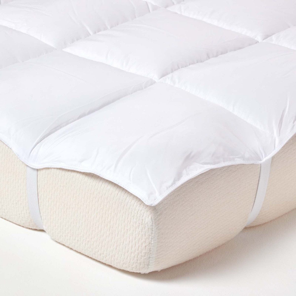 Der hypoallergene Matratzentopper punktet mit seiner Füllung aus 100% daunenähnlicher Super-Mikrofaser und sorgt für zusätzlichen Komfort beim Schlafen.