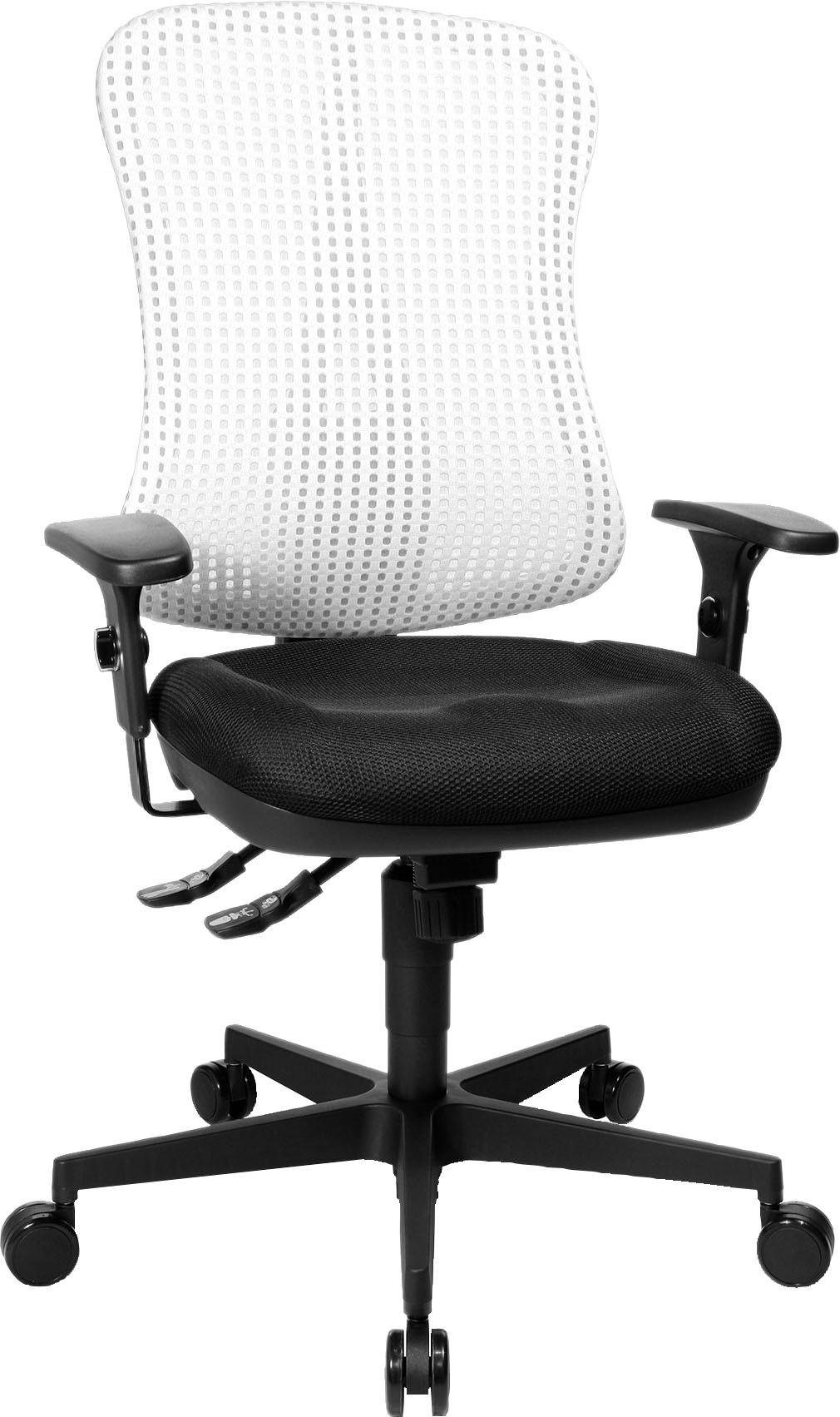 Wissenswertes | Drehstuhl mit taillierter Netz-Rückenlehne. Stufenlose Sitzhöhenverstellung mit Toplift. Ergonomische taillierte Rückenlehne, über Rastermechanik höhenverstellbar mit integrierter Lendenwirbelstütze. Bequemer Muldensitz. Punktsynchron-Mechanik, zur Verstellung der Sitz- und Rückenlehnenneigung, Federkraft individuell auf das Körpergewicht einstellbar, mehrfach arretierbar. Neues Design-Fußkreuz Polyamid schwarz, ausgerüstet mit lastabhängig gebremsten Sicherheitsdoppelrollen für Teppichböden. Inklusive höhenverstellbare Armlehne »P4«. Strapazierfähiger und robuster Stoff- und Netzbezug aus 100 % Polyester. Dieses Modell trägt das GS-Zeichen der Intertek in Fürth und erfüllt in diesem Zusammenhang sämtliche sicherheitsrelevanten Voraussetzungen. In folgenden Farben erhältlich: