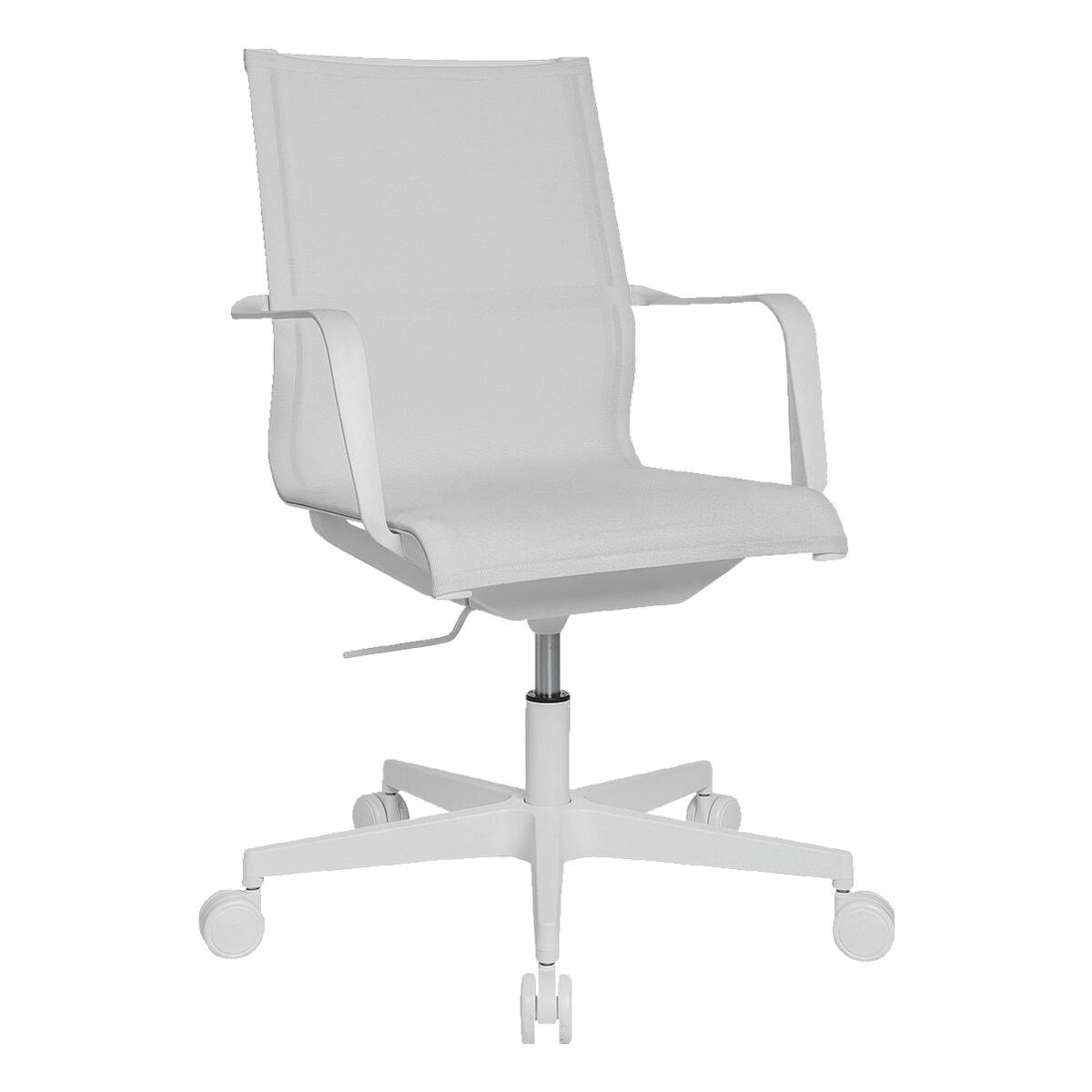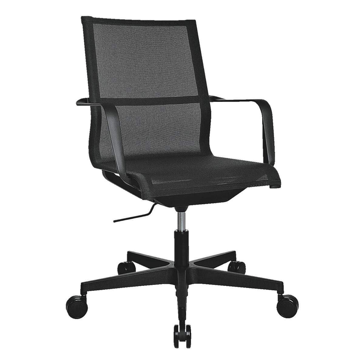 Mit festen, ergonomischen Armlehnen, Netzrückenlehne und stabilem Polyamid-Fußkreuz mit Weichbodenrollen