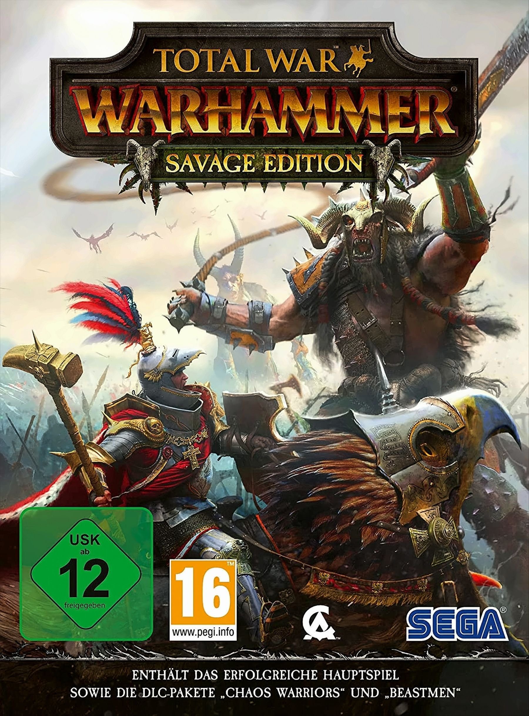Spielbeschreibung | Das Spiel kombiniert die spannende, rundenbasierte Strategie und die packenden, kolossalen Echtzeitkämpfe mit dem Warhammer-Universum von Games Workshop.Die Savage Edition beinhaltet alle bisher erschienenen kostenlosen DLCs sowie Patches und komplettiert das Spiel mit den Erweiterungen "Chaos Warriors" und "Call of the Beastmen".Hunderte Stunden fesselndes Gameplay erwarten Sie, wenn Sie auf der gigantischen Kampagnenkarte Kriege führen. Erforschen Sie mysteriöse Wälder voller Magie, lebensfeindliche Einöden und mit Eis bedeckte Bergmassive. Belagern Sie verwinkelte, turmbewehrte Städte und kämpfen Sie unterirdisch in gigantischen Höhlen. Setzen Sie vernichtende Zaubersprüche ein, die den Himmel teilen und das Schlachtfeld verschlingen. Richten Sie den Blick zum Firmament, denn erstmals in Total War stürzen sich fliegende Kreaturen ins Schlachtgetümmel und fügen dem Spiel eine völlig neue Dimension strategischer Tiefe hinzu.Erobern Sie die Alte Welt als Imperium, Orks & Goblins, Vampirfürsten, Zwerge und jetzt auch als verkommene Chaoskrieger oder als wilde Tiermenschen.Medienanzahl: 1Sprache/Untertitel: Englisch |