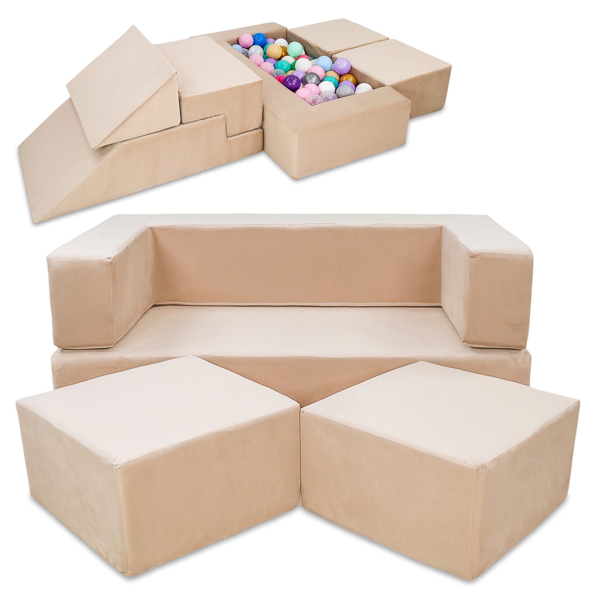 Mit seinen neutralen Farben fügt sich das Sofa harmonisch in jede Kinderzimmergestaltung ein und bleibt ein stilvoller Blickfang. Dieses Set ist die perfekte Ergänzung für jedes Kinderzimmer – ob als Spielmöbel oder bequeme Couch. Es bietet endlosen Spaß, fördert die motorische Entwicklung und unterstützt die Kreativität Ihres Kindes.
