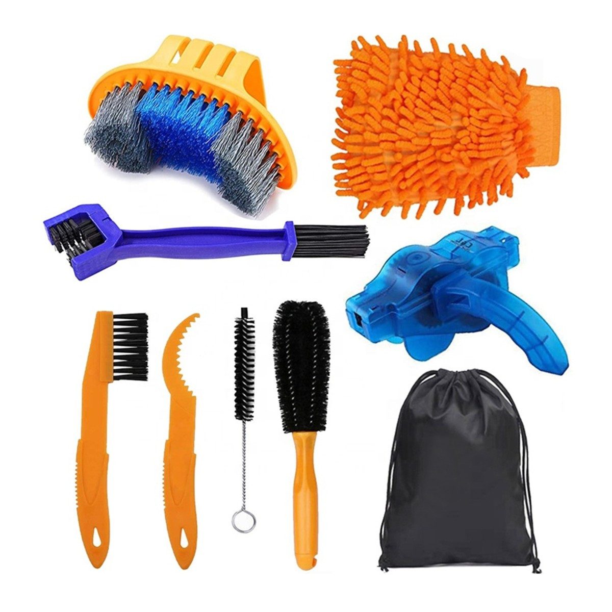 • Set bestehend aus 8 Reinigungswerkzeugen: Kettenreiniger-Bürste, Reifenbürste, Doppelseitiger Reinigungshandschuh, Kleine Kontaktbürste, Rundumbürste, Zahnradschaber und -bürste, Kettenbürste