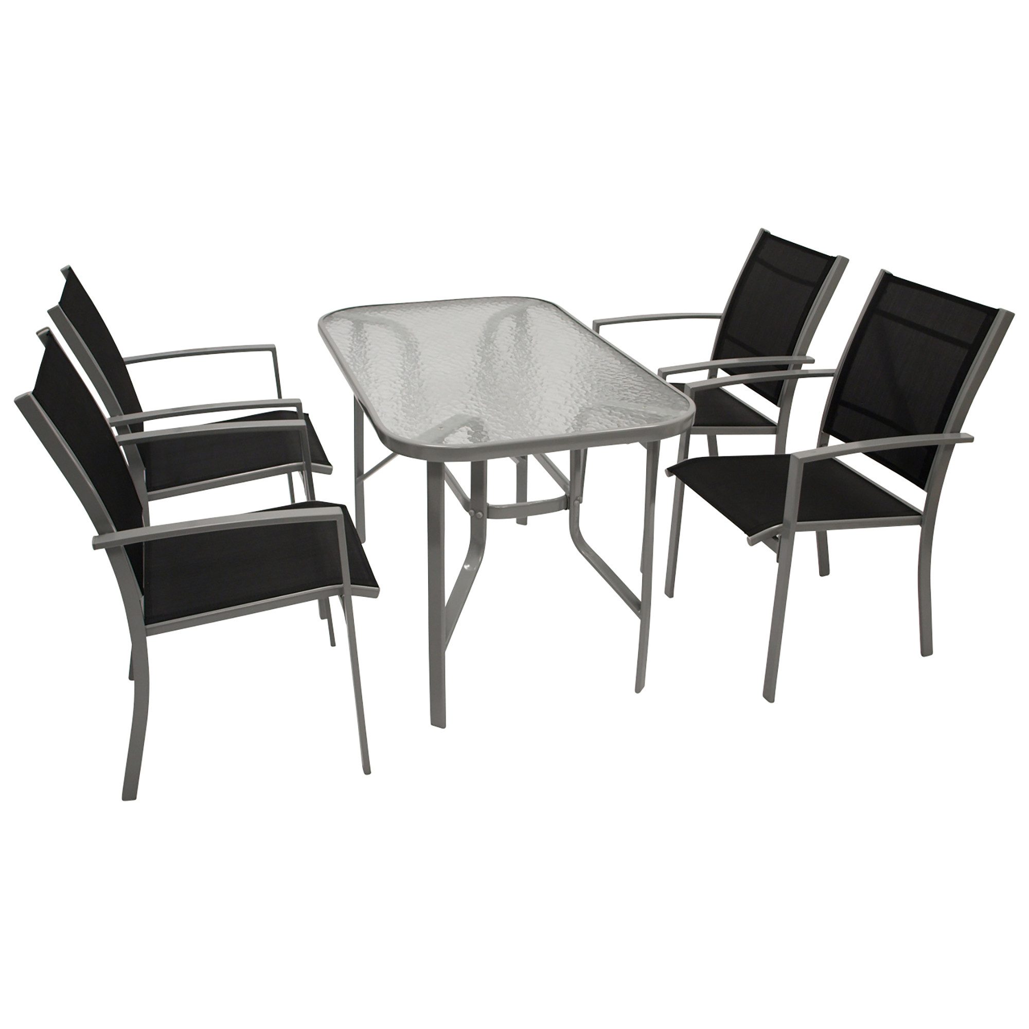 Die solide TPFGarden Gartenessgruppe LEEDS überzeugt durch seine langlebige Verarbeitung und modernes Design. Es besteht aus vier komfortablen Stapelsesseln mit schwarzer Textilbespannung und einem Tisch mit strukturierter Glasplatte.