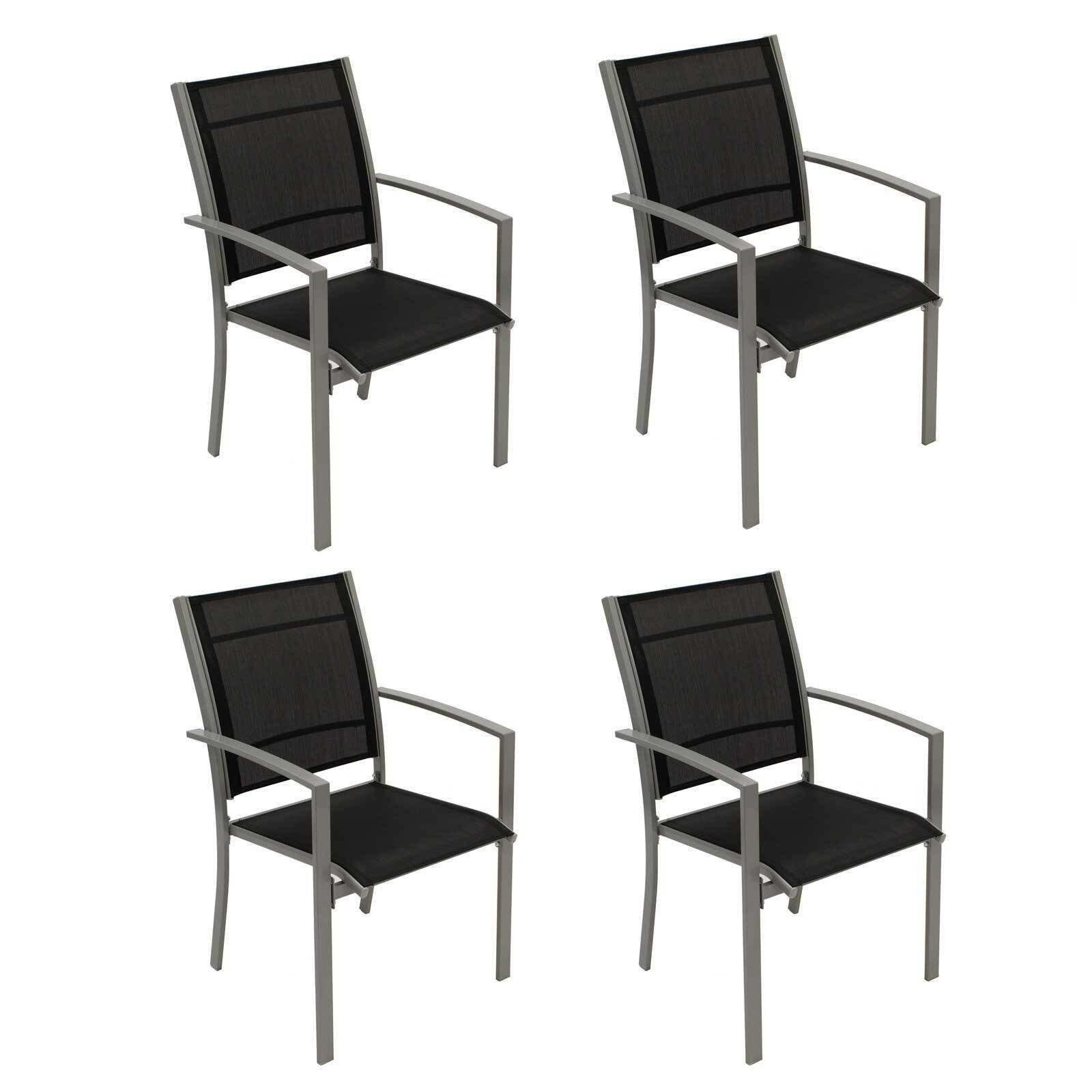 Dieses praktische 4er-Set Gartenstuhl LEEDS überzeugt durch Stabilität, Komfort und modernes Design. Die Stühle bestehen aus einem silbergrau pulverbeschichteten Metallgestell und sind mit einem strapazierfähigen, wetterfesten Textilgewebe in Schwarz bespannt.