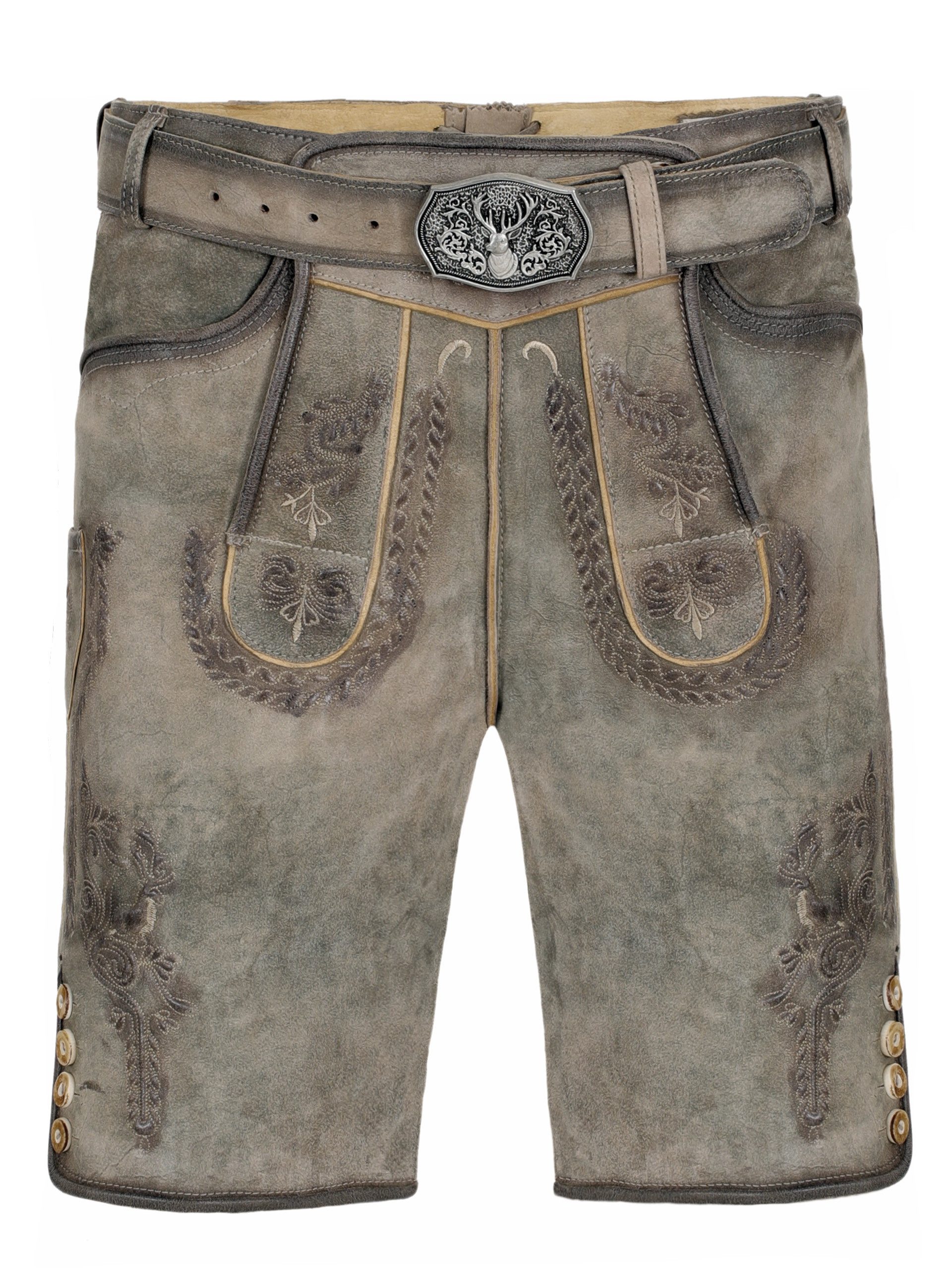 Wer Tracht mit Anspruch sucht, wird bei der Lederhose Ulrich fündig. In einem edlen Eschefarbton gehalten, vereint dieses Modell klassische Elemente mit modernem Flair. Hergestellt aus feinstem Ziegenveloursleder, bringt Ulrich nicht nur höchsten Tragekomfort, sondern auch eine authentische Optik mit, die dich zum absoluten Blickfang auf jedem Fest macht. Die fein ausgearbeiteten, traditionellen bayerischen Stickereien unterstreichen den handwerklichen Charakter dieser Hose und setzen stilvolle Akzente an Latz, Beinen und Seiten. Jedes Detail zeugt von Qualität und echtem Traditionsbewusstsein – ideal für Liebhaber der echten, ursprünglichen Tracht. Ein echter Hingucker ist der robuste Ledergürtel, der mit einer markanten Hirschmotivschnalle ausgestattet ist. Diese verleiht dem gesamten Look eine kraftvolle, maskuline Note und sorgt gleichzeitig für einen sicheren, bequemen Sitz. Dank des hochwertigen Ziegenveloursleders trägt sich die Hose angenehm weich, ist gleichzeitig äußerst strapazierfähig und passt sich mit der Zeit perfekt an deine Figur an. Der dezente Farbton in Esche bringt Frische in deine Trachtensammlung und lässt sich wunderbar mit Hemden, Gilets oder modernen Trachtenshirts kombinieren.