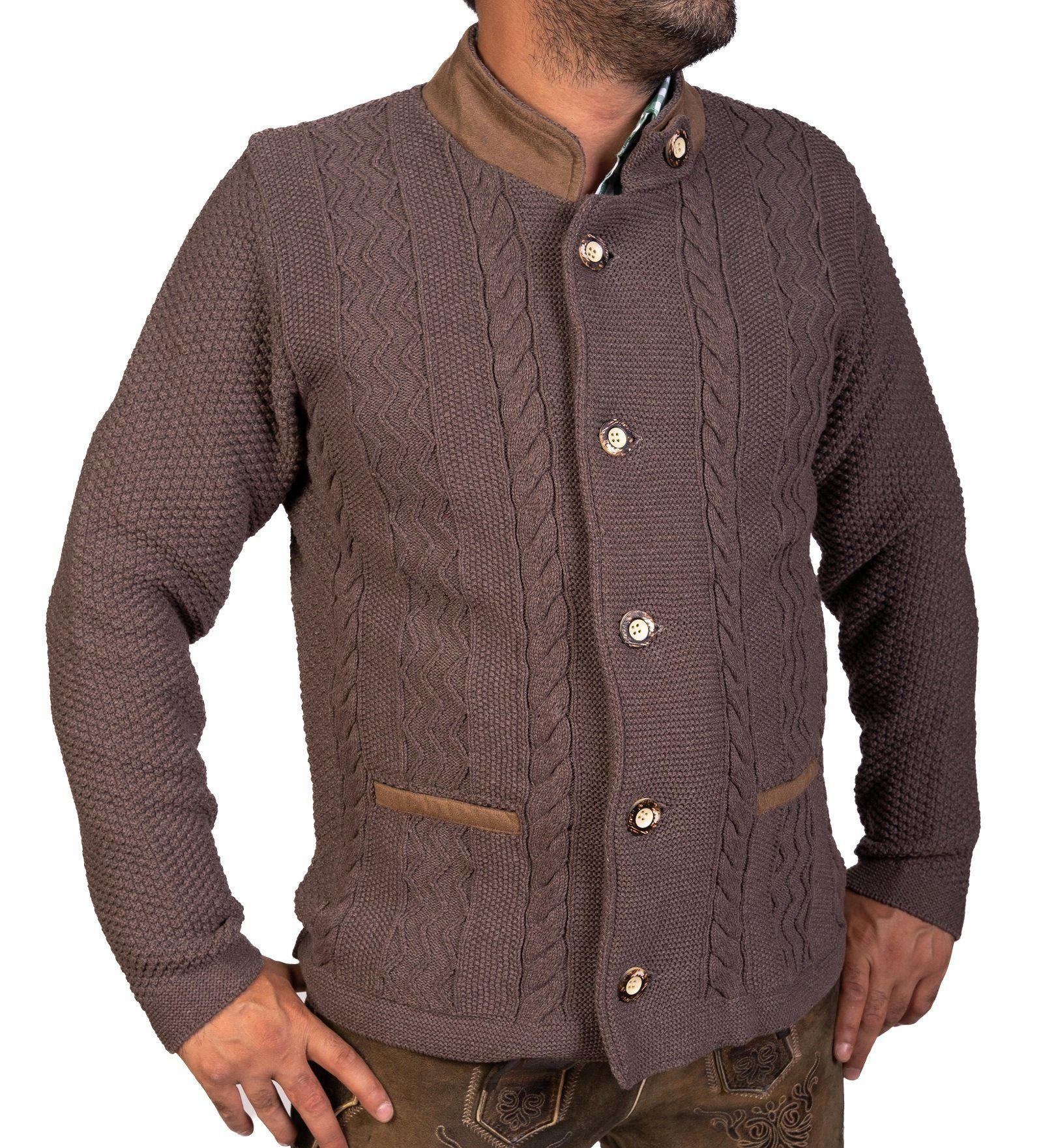 Die langärmlige Trachtenstrickjacke Markus von Trachtl ist durch ihren Wolle-Anteil perfekt für kalte Kirwanächte geeignet. In Linkstrick-Art mit geschmackvollen Kontrasten entlang des runden Ausschnitts und der Knopfleiste in einem dunklen Braunton abgesetzt und gerade geschnitten. Dieses Farbspiel wiederholt sich an den Enden der Ärmel und am Abschluss. Die rustikalen Knöpfe zum Verschließen sind in traditioneller Hirschhornhoptik gehalten. Mit dem klassischen Strickmuster in Linksstrick-Art passt die Strickjacke herrlich zur Lederhose und Trachtenjeans.Tipp:Perfektionieren Sie die Trachtenstrickjacke mit einem schicken Hemd und einer tollen Lederhose.Pflegehinweis:30°C Feinwäsche, bei geringer Hitze bügelnMaterial : 100 %Baumwolle