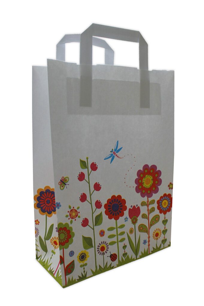 Die Taschen sind mit einem Flachhenkel innen geklebt und das Motiv ist auf weißem Papier gedruckt. Die Tragetaschen sind vielseitig einsetzbar, beispielsweise für Modegeschäfte, Läden, Boutiquen, Verkaufsstände, Privatgebrauch.