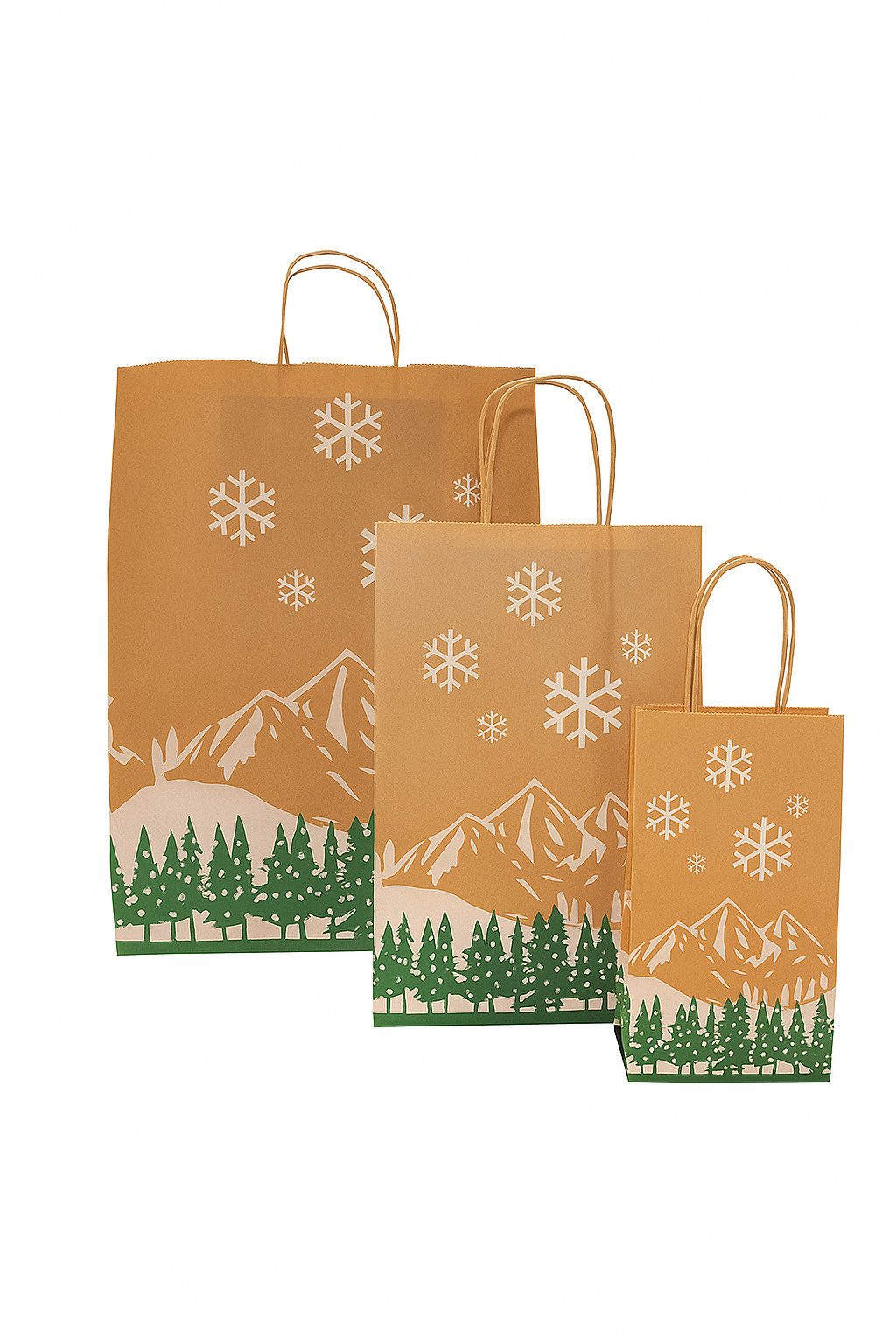 • weiße Schneekristalle mit weißen Bergen und grünen Tannen auf brauner Papiertragetasche