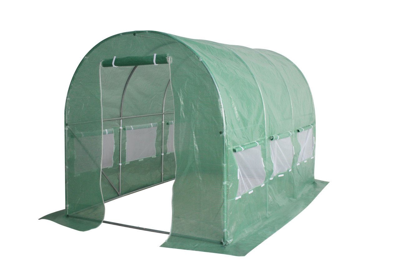 Produktdetails: Aufstellmaß: 200 x 300 x 200 cm (B x L x H) | Grundfläche: 6 m² | Wandstärke: 4 mm | Firsthöhe: 200 cm | Dachform: Tonnendach | Material: Stahlgestänge verzinkt, Polyethylen netzverstärkt | Farbe: grün | ohne Bodenplatte | Tür mit Reißverschluss, seitlich jeweils 3 Aufroll-Fenster | Lieferumfang: Gestänge, Folie |