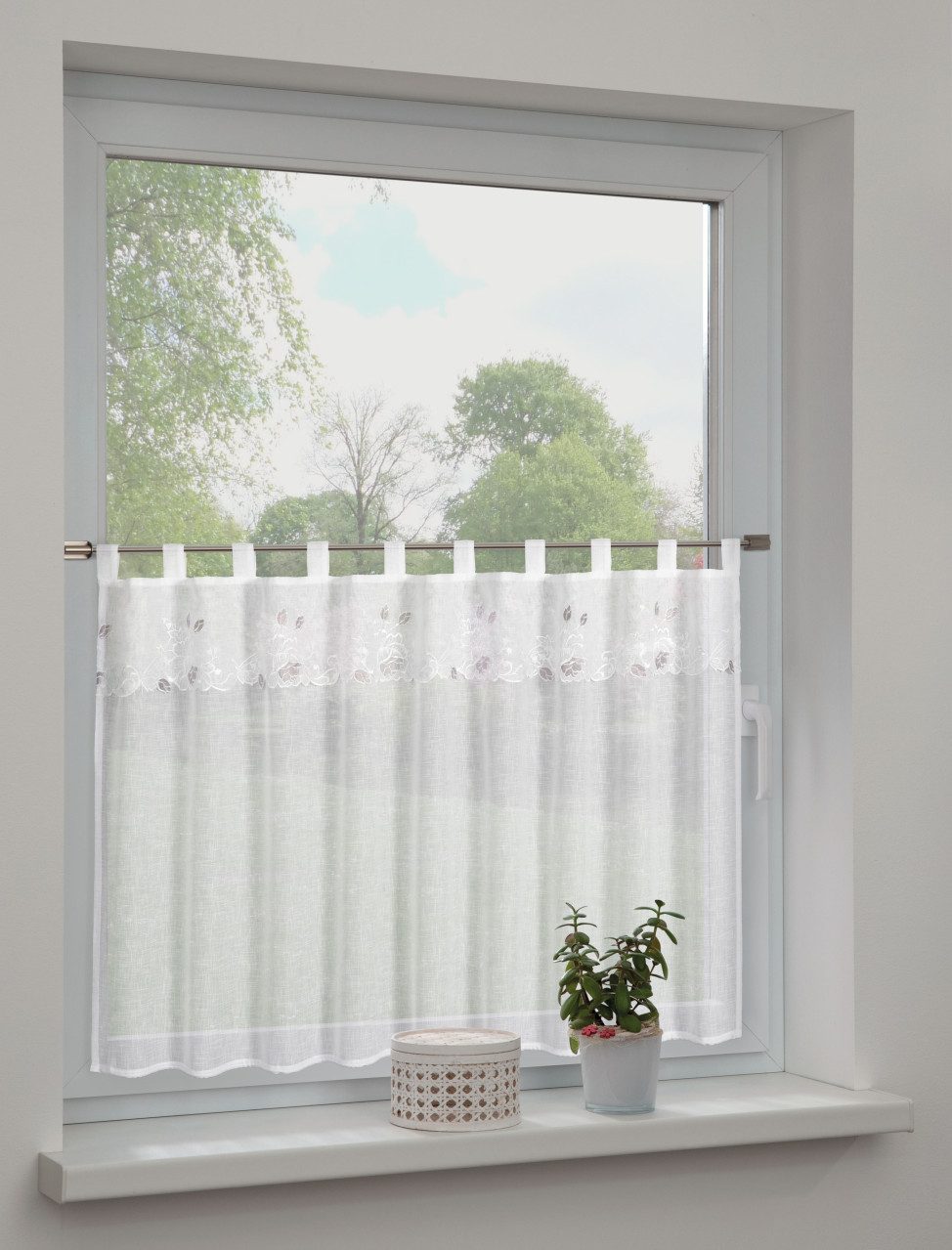 Die weiße Bistrogardine im floralen Design (75 x 135 cm) verleiht jedem Raum eine charmante Leichtigkeit. Mit zarten Mustern und hochwertiger Verarbeitung sorgt sie für stilvollen Sichtschutz und eine gemütliche Atmosphäre.