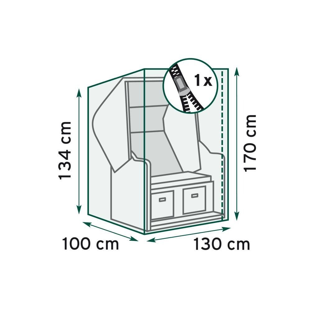 Die TrendLine Schutzhülle Exclusive für Strandkörbe wurde entwickelt, um Ihren Strandkorb optimal vor den Elementen zu schützen. Mit großzügigen Maßen von 130 x 100 x 134 - 170 cm (L x B x H) bietet diese Abdeckung nicht nur eine ideale Passform, sondern auch einen exklusiven Schutz vor Nässe, Staub und Schmutz.Die herausragende Funktionalität dieser Schutzhülle zeigt sich in ihrer Effizienz gegenüber den verschiedenen Witterungsbedingungen. Das hochwertige Material gewährleistet nicht nur einen effektiven Schutz vor Nässe, sondern auch vor Staub und Schmutz, um die Lebensdauer Ihres Strandkorbs zu verlängern.Mit der TrendLine Schutzhülle Exclusive setzen Sie auf durchdachte Funktionalität und Schutz im Detail. Die präzise Verarbeitung und das klare Design machen die Anwendung mühelos. Bewahren Sie die Qualität und den Charme Ihres Strandkorbs mit der exklusiven TrendLine Schutzhülle.