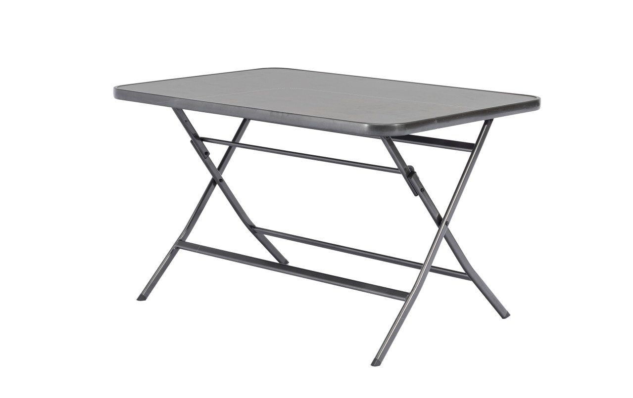 Produktdetails: Klappbar | für 4 - 6 Sitzplätze geeignet | Maße: 120 x 80 x 71 cm (L x B x H) | hochwertiger Stahl-Rahmen | Tischplatte 5 mm Strukturglas | Farbe: grau | Belastbarkeit: 35 kg | langlebig, pflegeleicht, hochwertig, witterungsbeständig | im Winter trocken lagern |