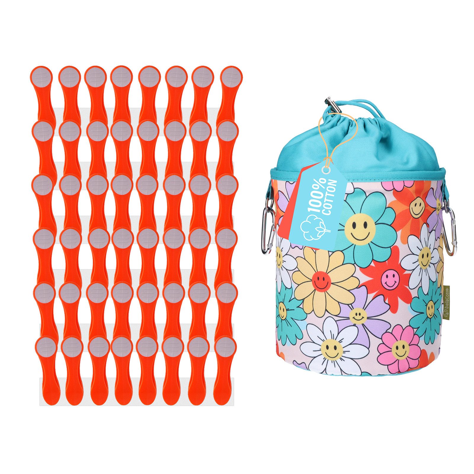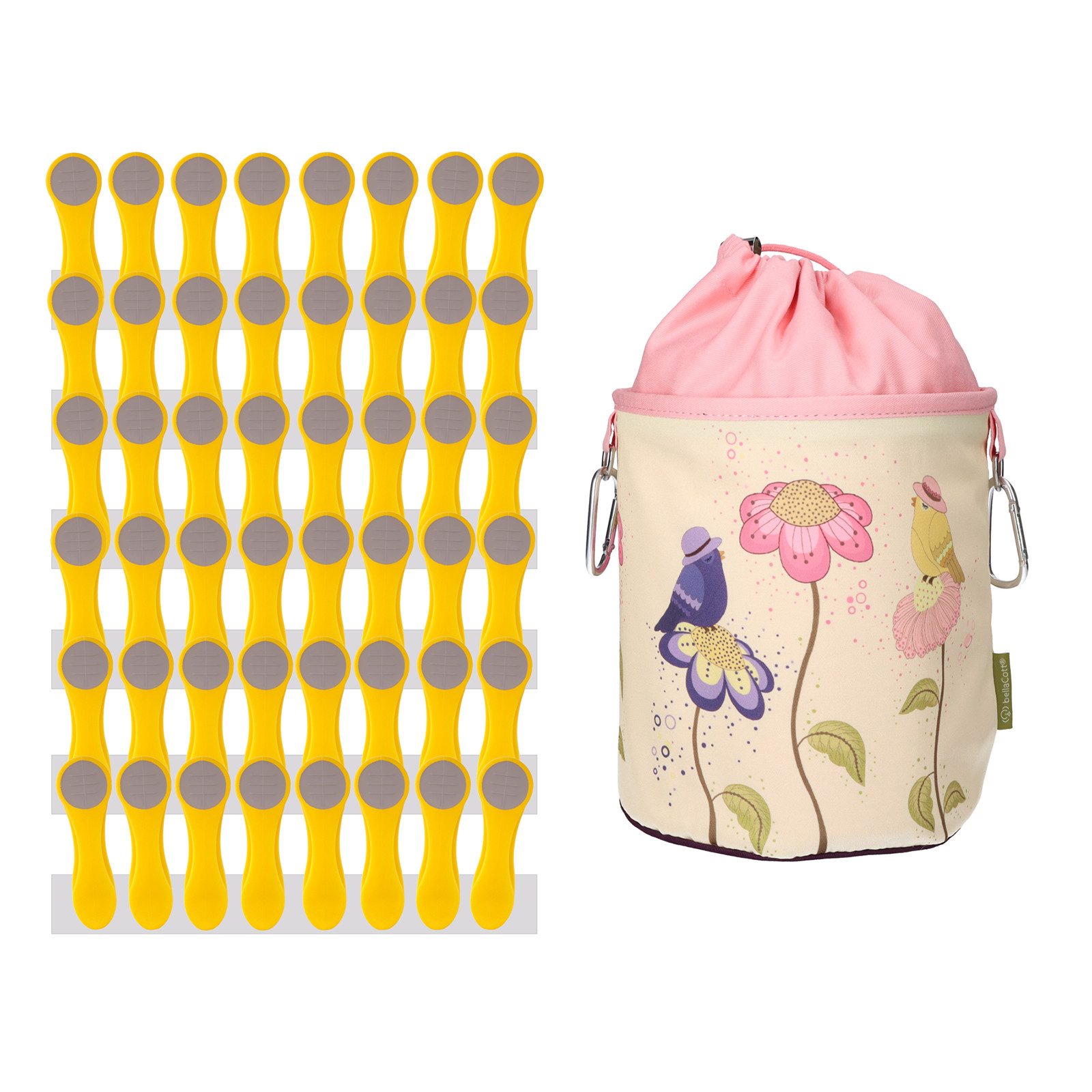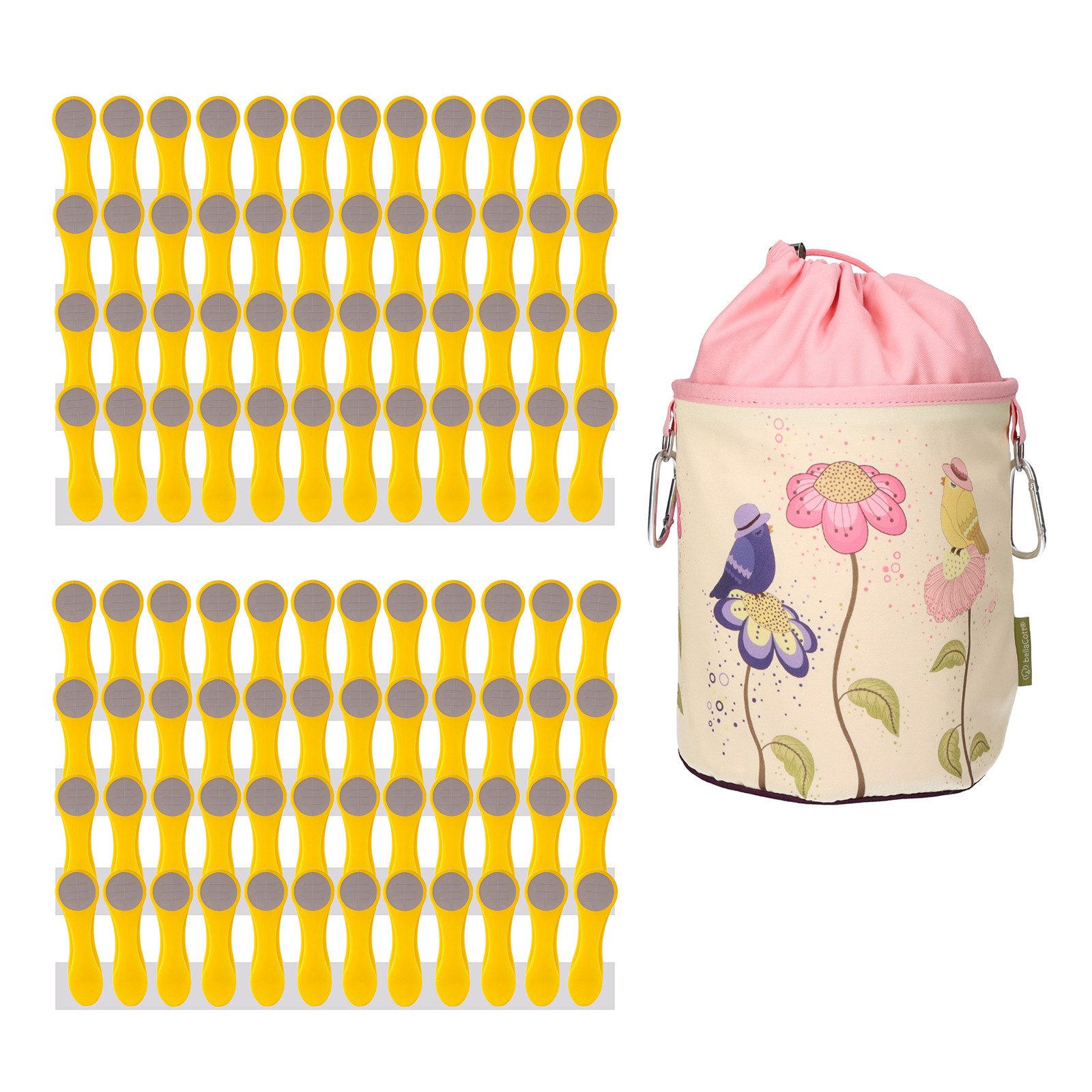 SETANGEBOT – Ein bellaCott Design Wäscheklammerbeutel Schildkröte und 48 gelb-graue Wäscheklammern mit Edelstahlfedern. Der Klammerbeutel ist mit der zuziehbaren Haube 28 cm groß, verfügt über zwei silberfarbene Aluminium-Karabinerhaken an den Seiten und einem Zugkordelverschluss mit Metallstopper, sodass die Klammern sicher verstaut sind und nicht aus dem Klammerbeutel herausfallen.