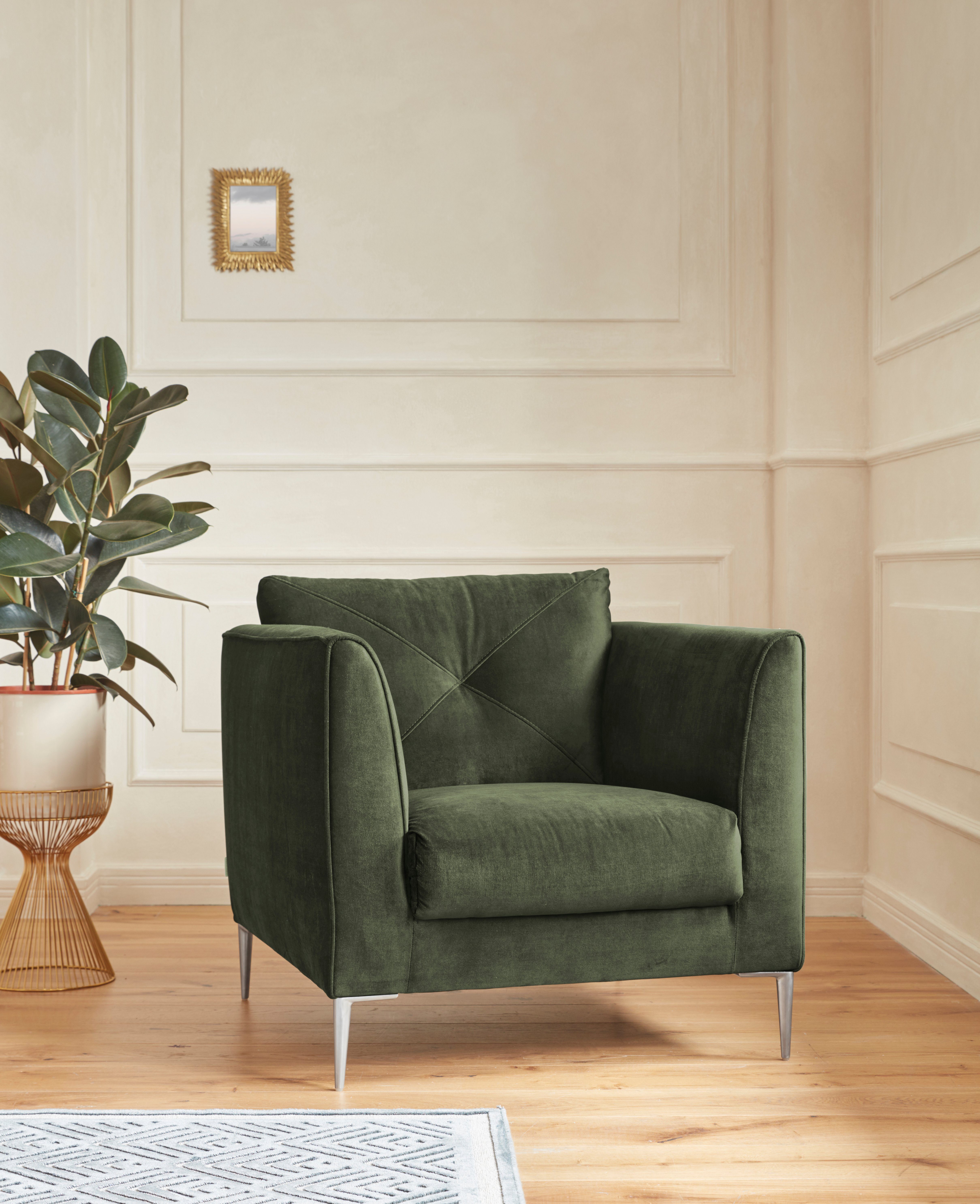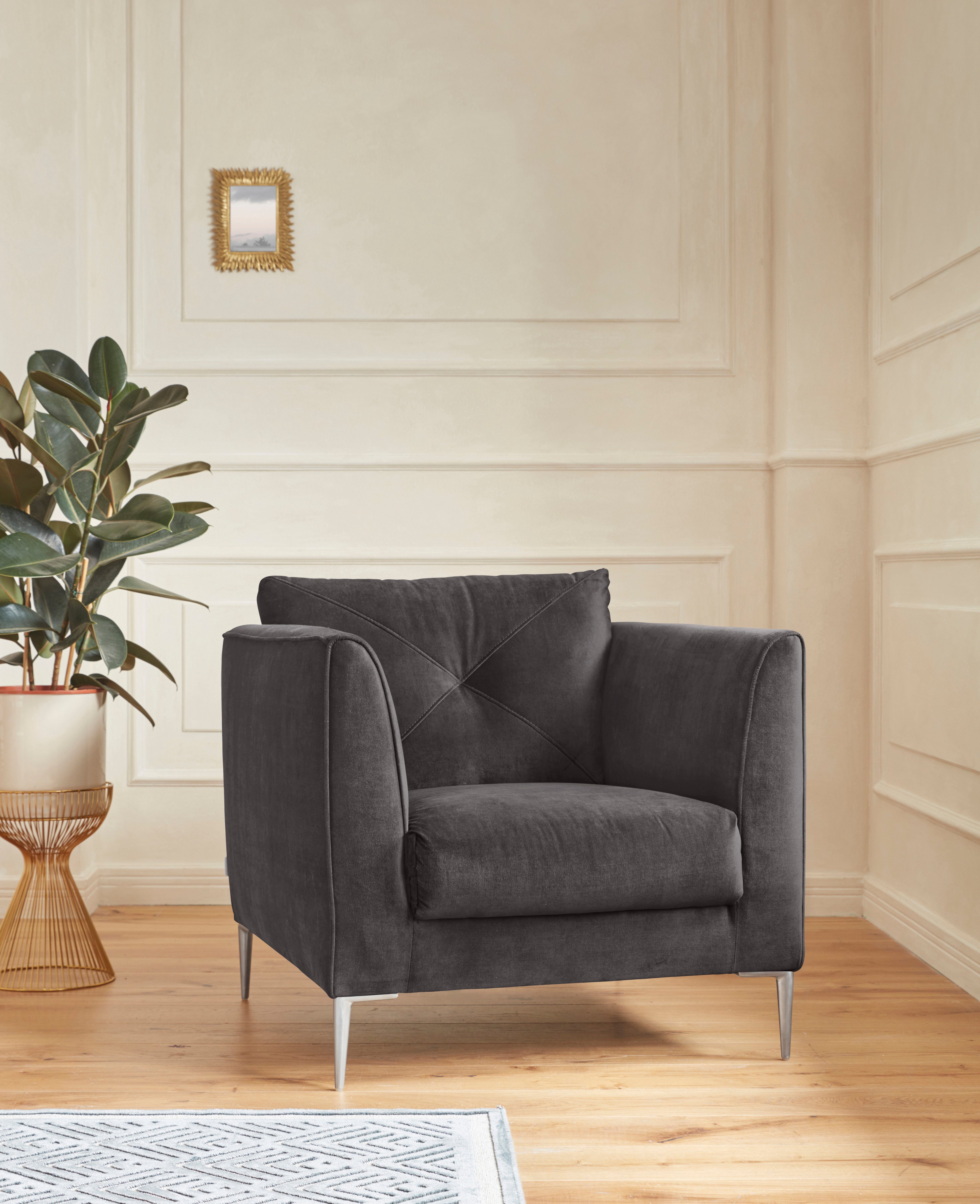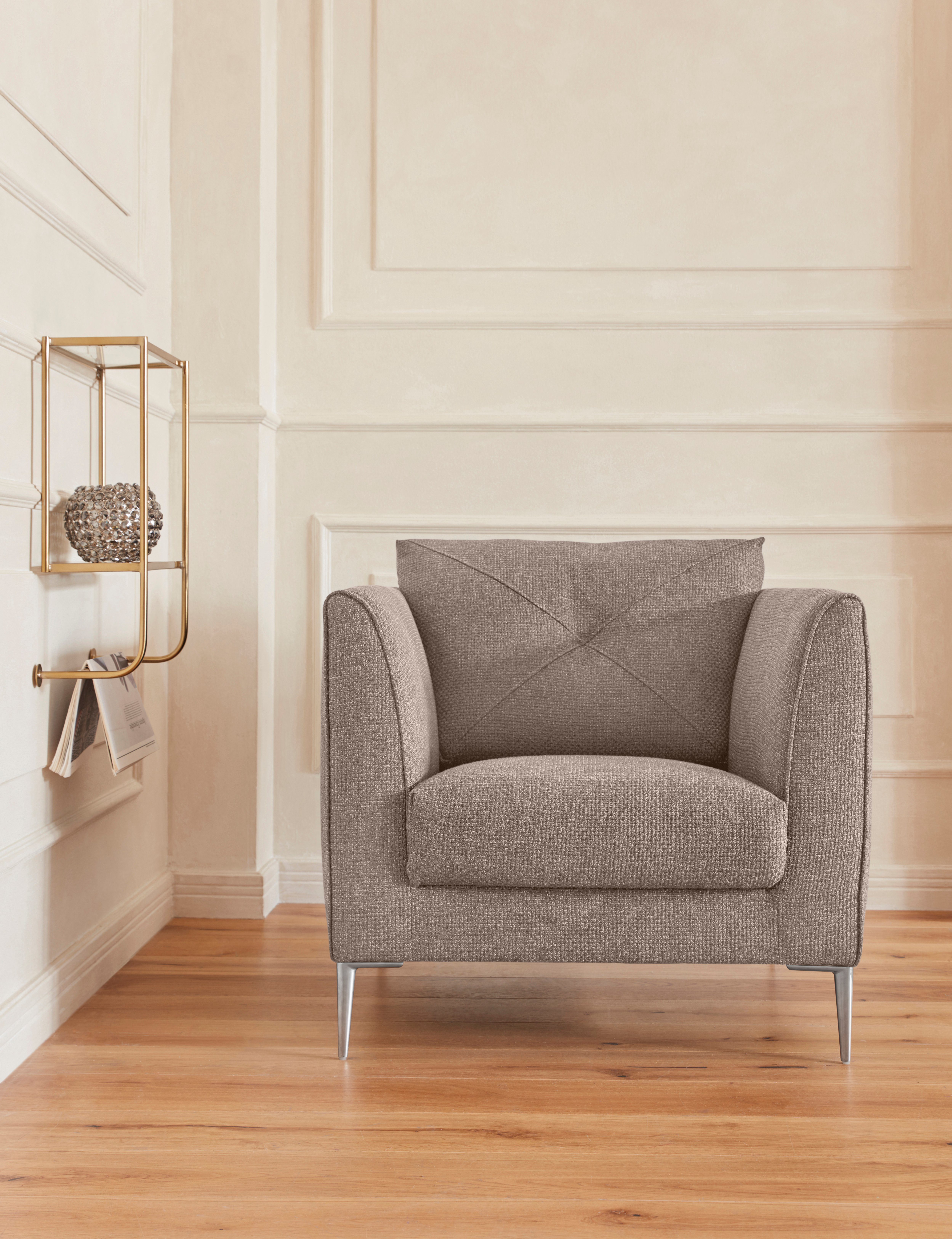 Wissenswertes | Elegante Kreuznaht im Rückenkissen, softer Sitzkomfort, in verschiedenen Farben und Stoffen erhältlich, extra hohe Füße aus Metall |