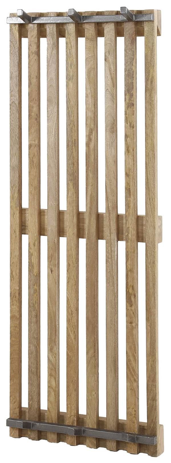 Holz in seiner schönsten Form! Wenn Sie bisher nur Mango als leckere Früchte kannten, lernen Sie diese Exoten jetzt noch von einer anderen Seite kennen. Das Holz hat einen mysteriösen Schimmer. Einen interessanten Kontrast bilden die Elemente Metall und Holz. Die Haken bestehen aus Metall in edlem Schwarz, das mit Pulver beschichtet wurde. Der leichte Antikeffekt der Metallhaken passt herforragend zum eher schlichten Erscheinungsbild der Holzleisten.Wenn Sie genug Platz für Turnbeutel, Schirme, Mützen und Regenmäntel brauchen - kein Problem, auch der ist vorhanden.