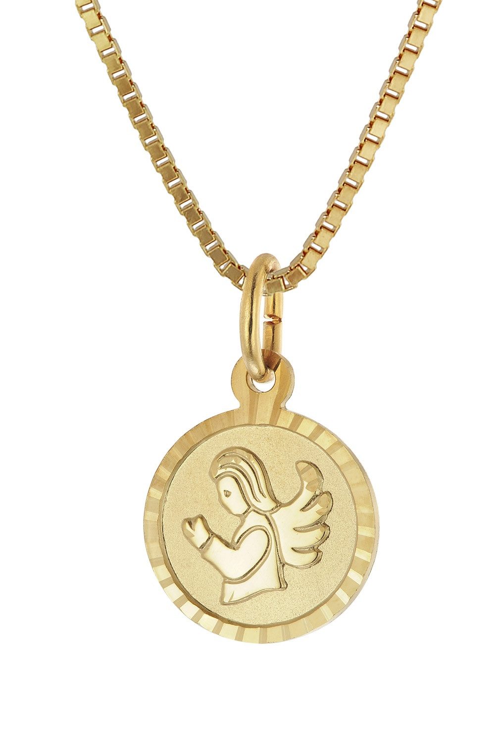 runder Anhänger aus 8-Karat Gold 333, mattierte Vorderseite mit Engel-Relief, diamantierter Rand, Rückseite matt, Durchmesser 10 mm, Venezianer Collierkette, aus goldplattiertem Sterlingsilber 925, Stärke 0,9 mm, Длина 40 cm, an Zwischenöse 38 cm lang tragbar, Federring-Verschluss, Made in Germany, Lieferung inklusive Mikrofaser-Pflegetuch, WEEE-Reg.-Nr.: DE 35331620. Achtung: Zum Schutz unserer Kleinsten empfehlen wir das Tragen von Kinderschmuck bei Kindern unter 3 Jahren nur unter Aufsicht von Erwachsenen, da insbesondere kleine Teile unter Umständen verschluckt werden könnten!